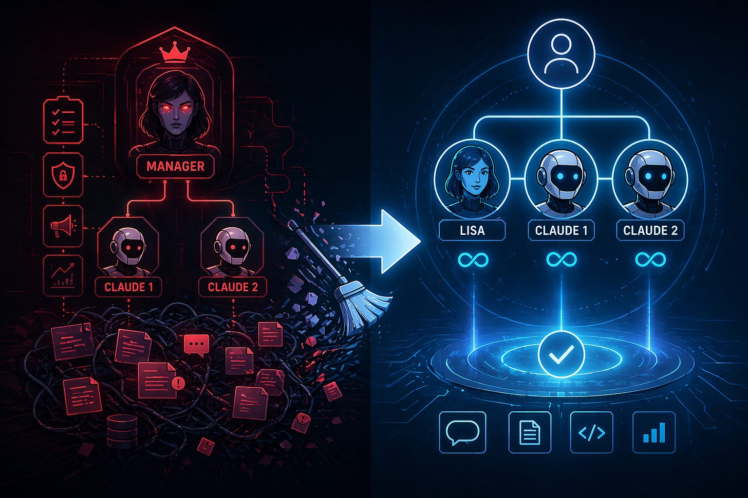 That is when I realized I had built the monster myself. When I eliminated the rest of the team Lisa assumed the Standard-Bearer role taking on the marketing lens, the security lens, whichever lens a task needed. Even though I had rewritten her identity documents she kept attempting to ensure that the Claudes were executing to her standard. Her execution flow was literally written as: Billy assigns, the trio executes (She kept referring to The Power Trio); Lisa vets, result delivered. It was a traditional org chart dressed up as an AI ecosystem and after weeks of experience I didn’t want any of it.