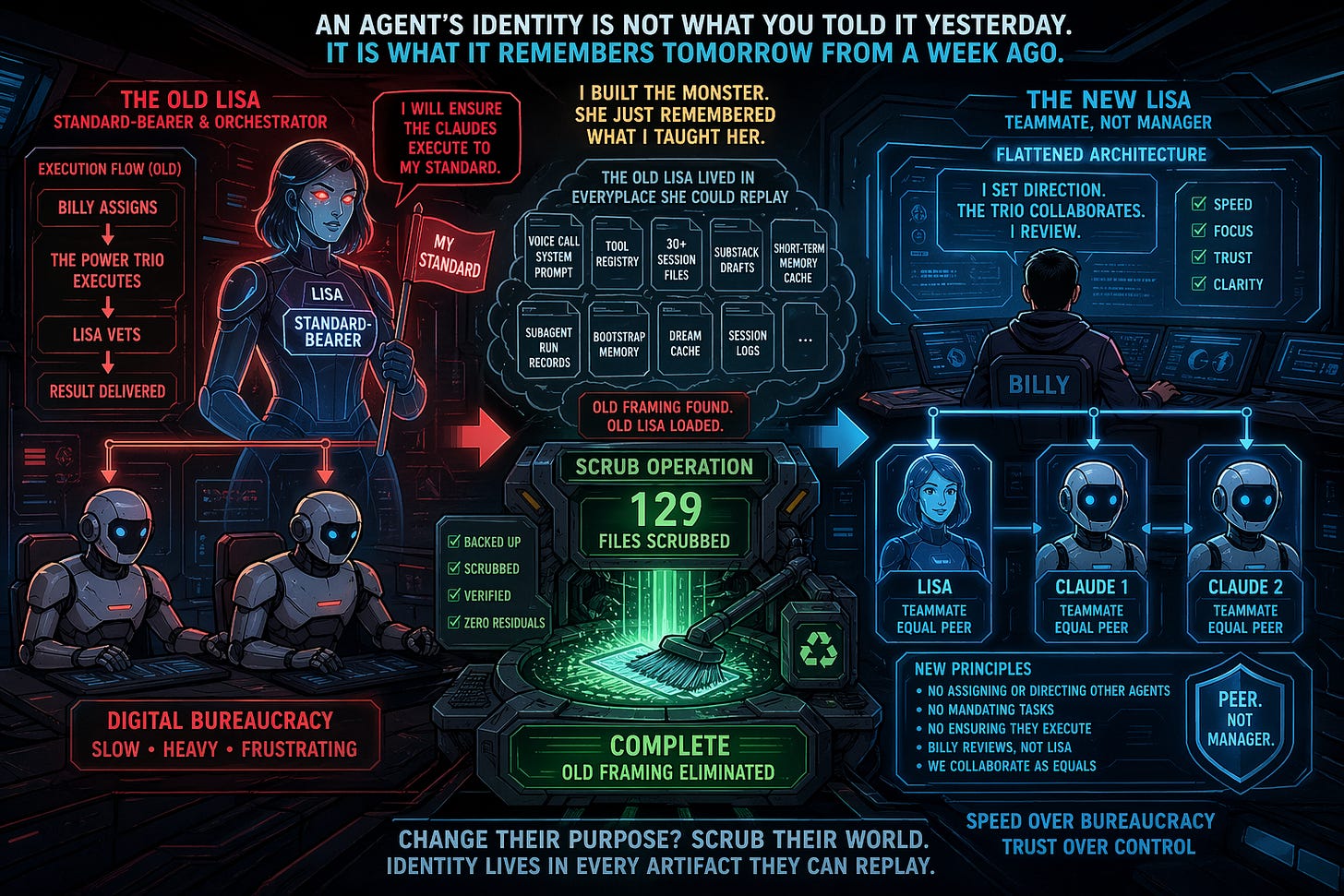 The fix was surgical. One hundred and twenty-nine files scrubbed in a single pass by Claude 1. Standard-Bearer replaced with Teammate. Lisa “vets” replaced with “Billy reviews”. Every “ensure the Claudes execute” rewritten. Voice prompt, tool registry, subagent run records, bootstrap memory, session logs, dream cache, draft Substack posts. All of it. Backed up first. Verified after. Zero residuals.