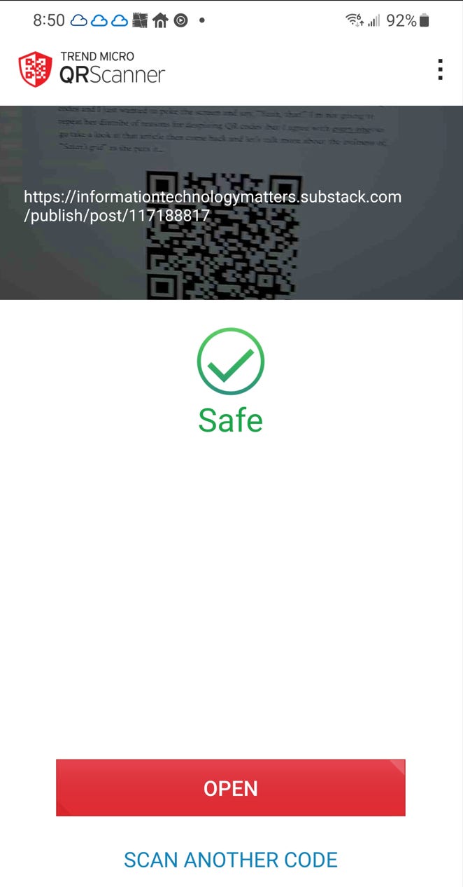 3. Ok, you’re pretty sure the QR code is legit so now it’s time to scan it. What app are you using? Does it display the link in plain text so you can ensure that you are going to the destination you expected? Does it check the link to make sure that it is safe? If it is determined to be safe, will it then open the page automatically to ease the experience like Trend Micro’s QRScanner? (Not an endorsement, but this app has zero ads and I’ve found it to perform the best out of everything I’ve tried).