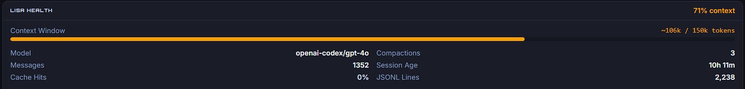 I'm happy that Lisa is running fresh again. The health dashboard confirms it. The performance confirms it. And most of all, the work we're doing together feels responsive again, like the system is fully present rather than running on fumes.