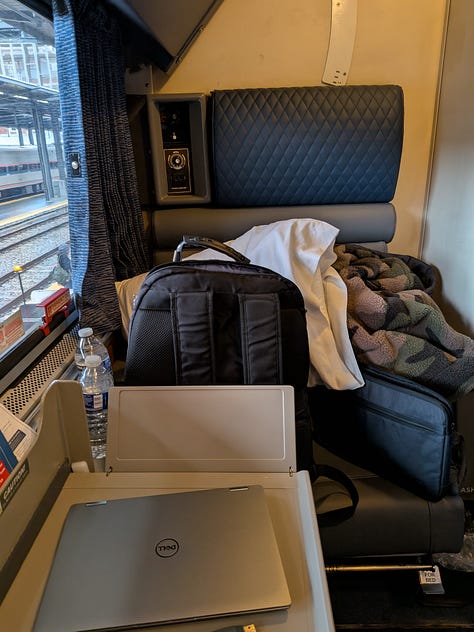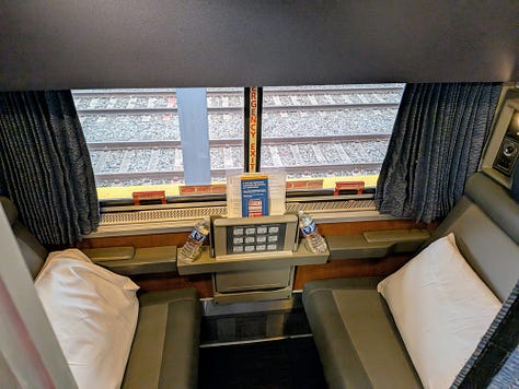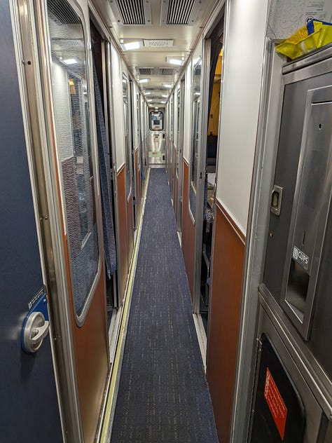 I proceeded to car 1130, then upstairs and down a hallway flanked on both sides by roomettes (the smallest and cheapest private space you can purchase and still have it be a room that holds two people and entitles each rider to meals along the route included). I settled in, logged in and got to work.