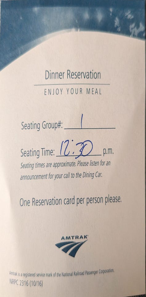 Boarding time arrived and we were allowed to get on Amtrak’s Coast Starlight which travels between Seattle and Los Angeles (though I’d say the name is a misnomer for most of the trip, as it doesn’t even come close to the coast until it gets below San Francisco).