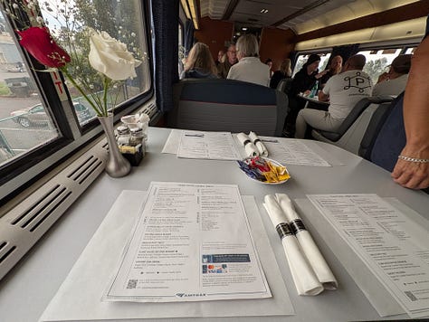 My lunch reservation was set for 1230, so when they called my seating I headed to the dining car and sat down at the communal table, meeting Becky from Phoenix, Arlene from Alaska and David from Salinas all riding the rails simply for the experience. Our waiter, also a David, took our orders, served up drinks and left us to get to know our dining-mates (It is an Amtrak tradition that any groups under 4 people will be seated with other guests to fill up the 4-person tables).