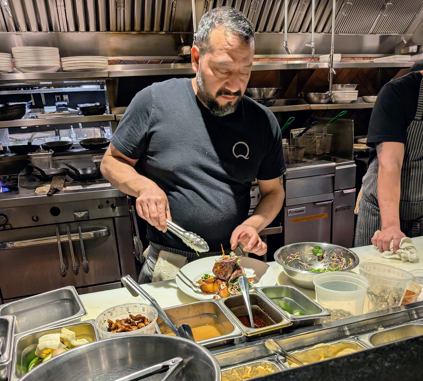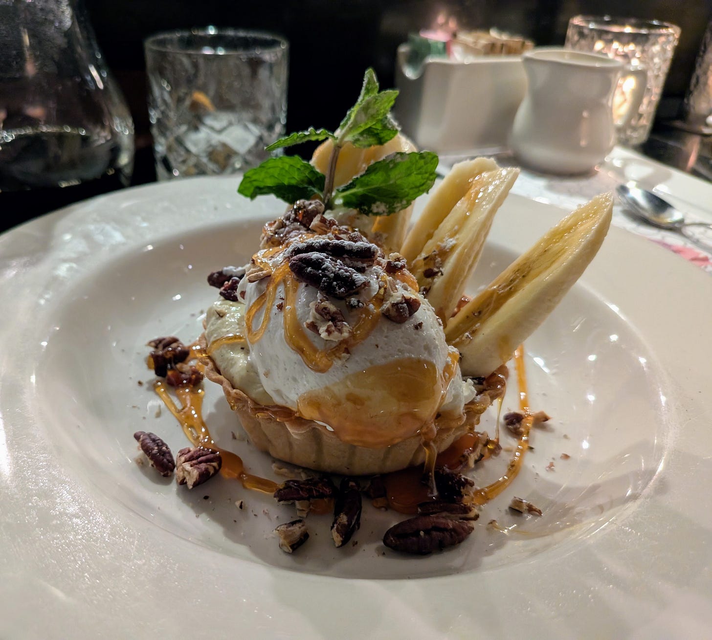 Dessert felt non-negotiable at this point. Q’s dessert menu is always strong, and once again the chef steered me right with the Caramel Banana Cream Tart. Despite its appearance, the dessert was surprisingly light, built on a vanilla shortbread crust with banana pastry cream, fresh bananas, Chantilly, and toasted pecans.