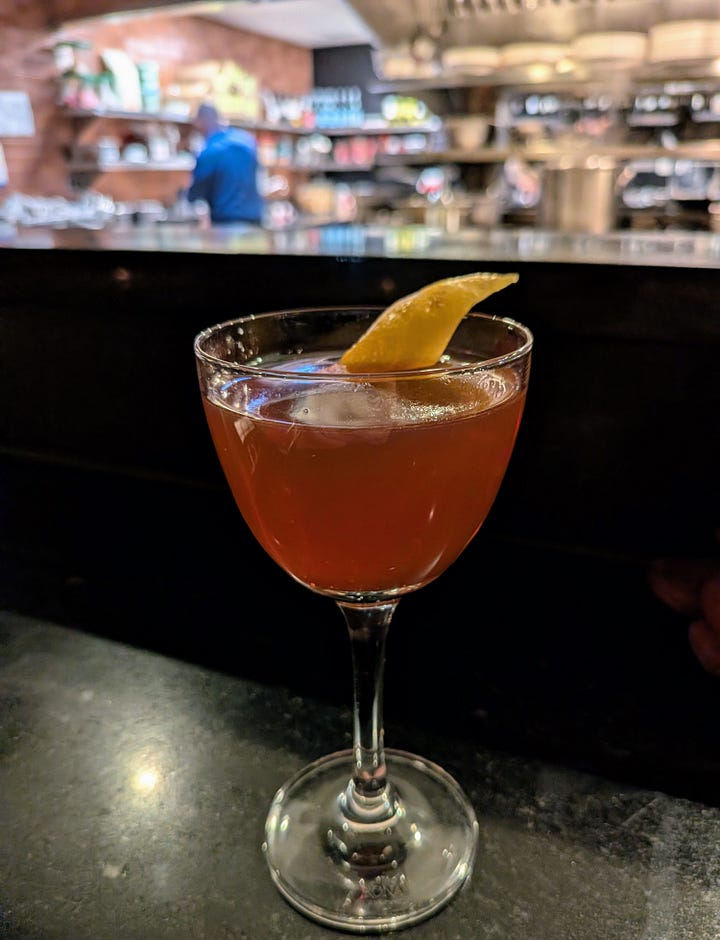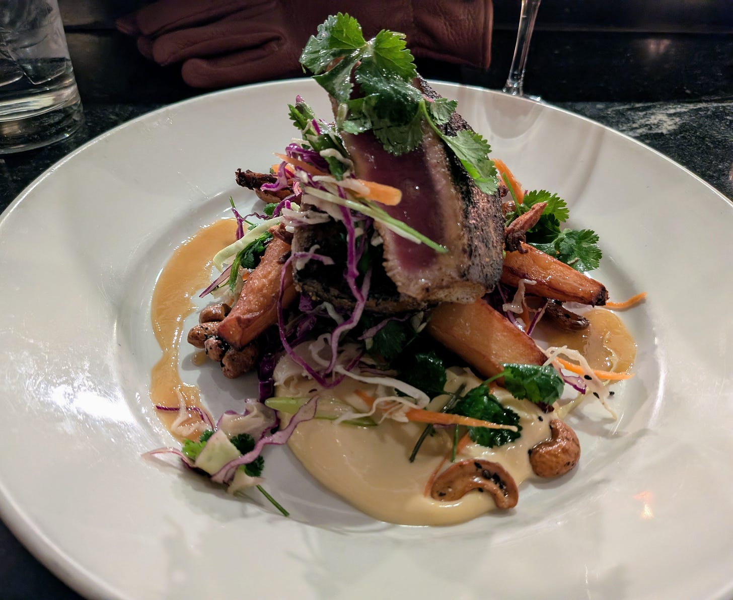 While chatting with the chefs, I was encouraged to try the Seared Ahi Tuna, served over sweet potato frittes with miso aioli, lightly dressed julienned cabbage, and another hit of those sweet and spicy cashews for texture. I followed the recommendation and was glad I did. I paired it with the Seasonal Crush cocktail, a mix of bourbon, kumquat purée, tangerine, lemon, Canton ginger liqueur, and cardamom bitters. Together, they made for a satisfying and cohesive main course.