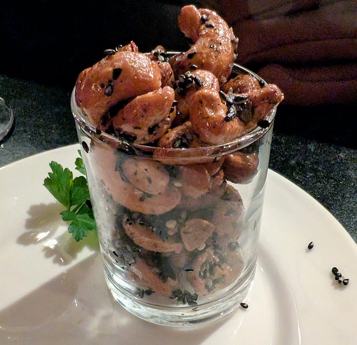 My evening began simply with a Classic Sazerac, paired with Sweet and Spicy Black Sesame Candied Cashews. The cashews were addictive, and the pairing struck a great balance between warmth, sweetness, and spice. A small opening, but a confident one.