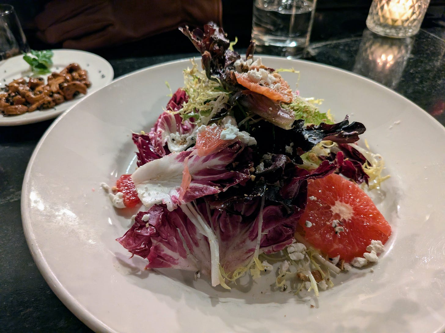 Next came the Winter Citrus Salad, built around winter greens, honey pepper vinaigrette, peppered chèvre, candied hazelnuts, and a slice of pink grapefruit. Bright, fresh, and well-composed, it set up the rest of the meal nicely.