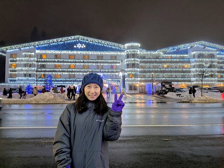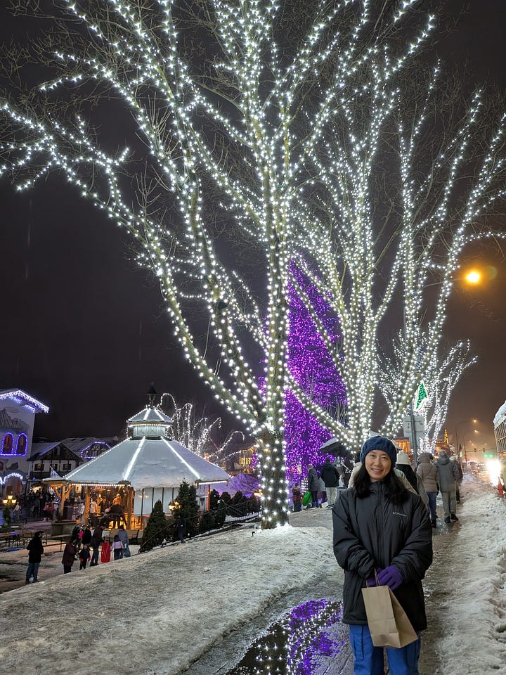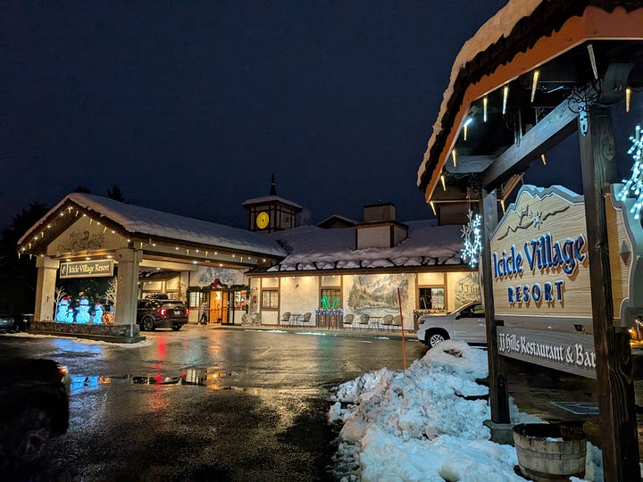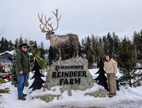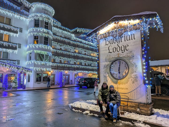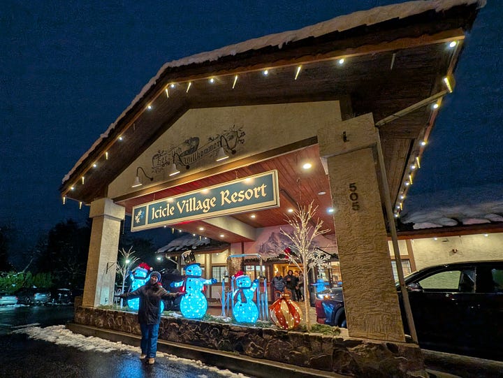 Without stops for charging the car (or our stomachs), it’s about a 5-hour drive from Portland up to the Bavarian-like town of Leavenworth, Washington. Add in the stops and reasonably it’s around 7-hours door-to-door. The drive is so beautiful though as we traveled the Gorge east along highway 84 with the Columbia River to our left and the view south out the window to our right of the many waterfalls whizzing past, time just flew by. About an hour in we crossed the Columbia River into Washington, turned north and traveled through the snow-covered mountains and the expansive Yakima Valley of central Washington along Highways 82, 90 and 97 before arriving in the early evening at the Icicle Village Resort, where we had a 2-room condo awaiting us.