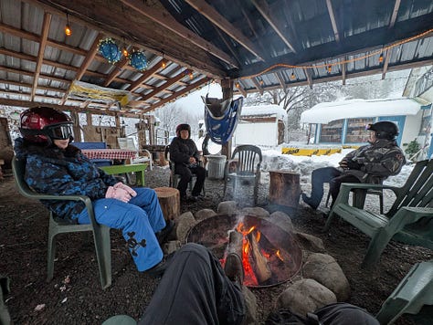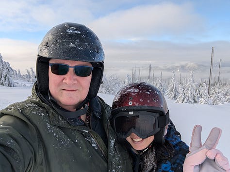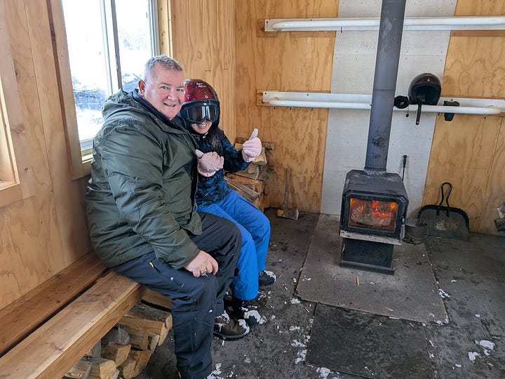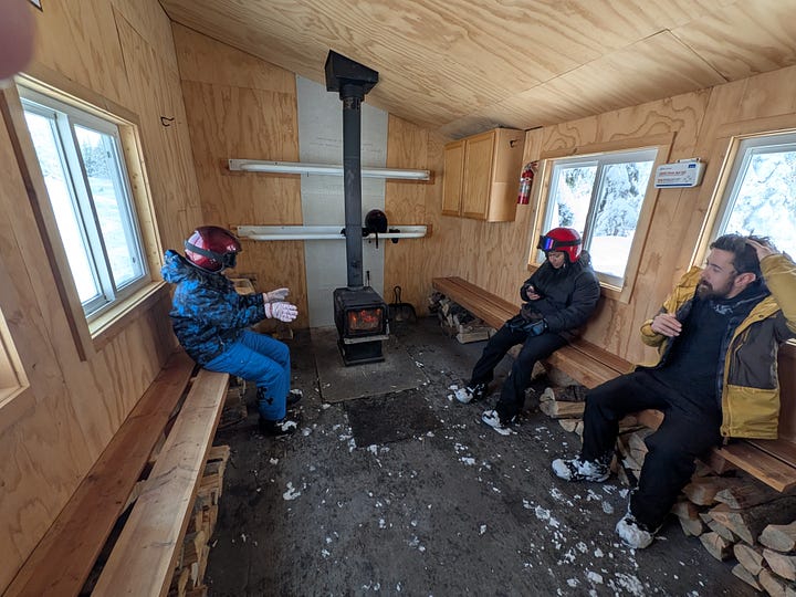The snow muffled all sound and with the fog swirling in the background, the trees covered in freshly fallen snow and the sun attempting to shine through the clouds it was all a bit surreal, peaceful and beautiful and we all took it in. Break time over, and with nearly 3-hours of experience under our belts, Robin let us freestyle a bit so B3 and I took off full throttle down the trail until we all met up again at the mountaintop warming hut.
