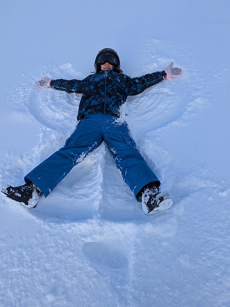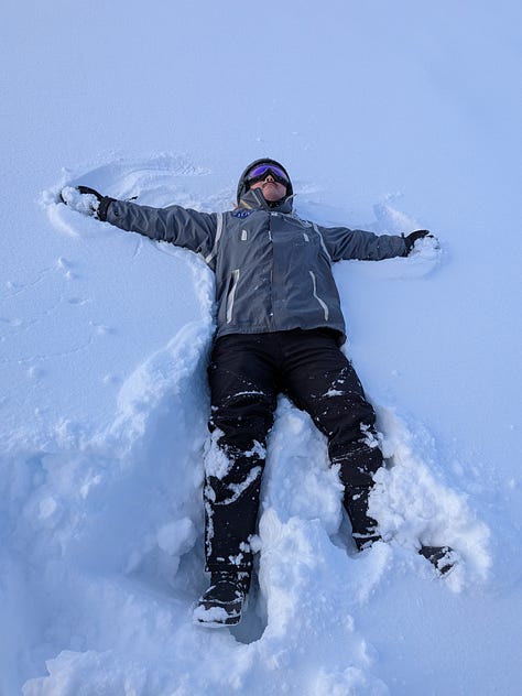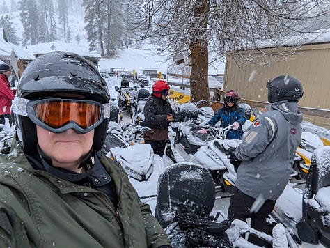 As we sped along the fully groomed trails, we headed back into the mountainous terrain over 6-miles, gaining hundreds of feet of altitude while fresh snow lightly fell on us and continued to pile up. About an hour into the ride, with the sky clearing, on top of one of the ridges we stopped and checked out the views (only barely becoming visible as the sun rose higher burning off the fog below us), took some pics and yes even made a few snow angels.