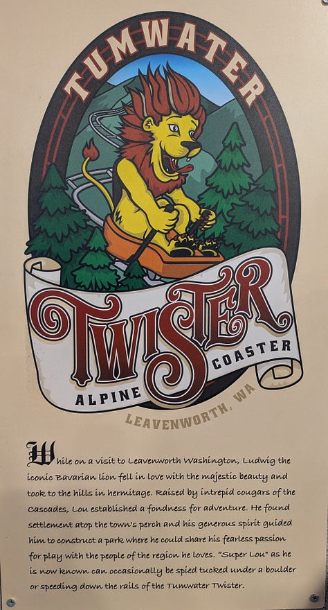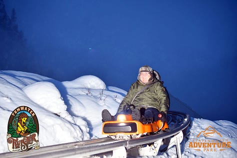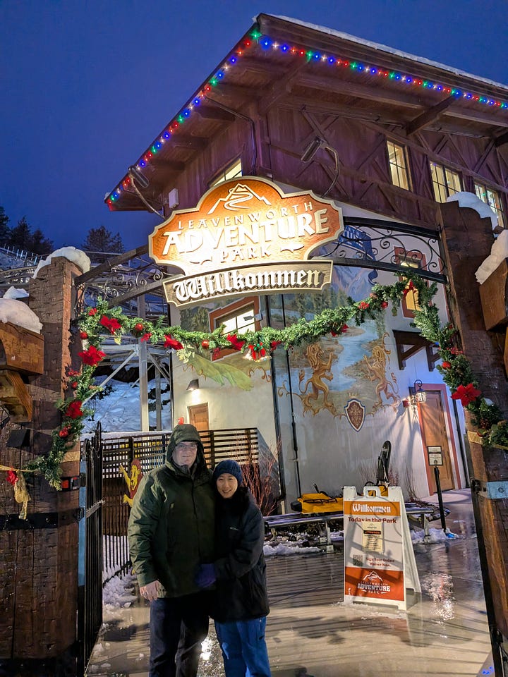 An easy 3-minute walk across the street from the resort is the Leavenworth Adventure Park, which includes the Tumwater Twister Alpine Coaster. We had reservations for two rides down the mountain and were all very excited to experience this adventure. (Here’s a site that does a great job reviewing the coaster and the experience. Except for the fact that snow was covering the ground during our experience, it pretty much mirrored what this author went through).