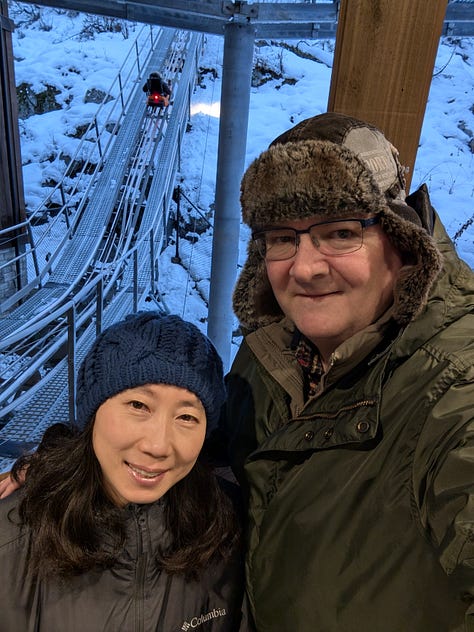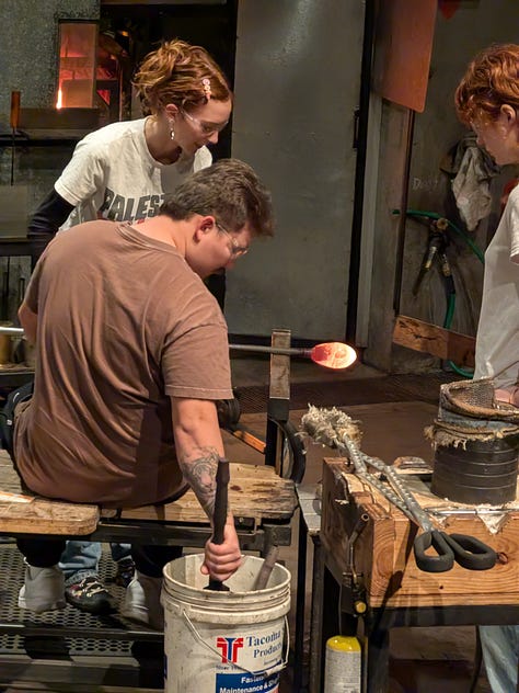 The final day of Part B, Week 1 of our Christmas Break 2024 started out early with breakfast downstairs, then a 45-minute drive south along Highway 5 to Tacoma for our 10am reservations at the Museum of Glass. Kay and I had tickets to see the gallery of glass art, but I was able to get two additional tickets for B3 and Tatiana to actually go into the Hot Shop to blow their own glass. They both ended up each making a paperweight which, after cooling for several days, will be shipped to them down in California. For local area residents the made articles can also be picked up locally.