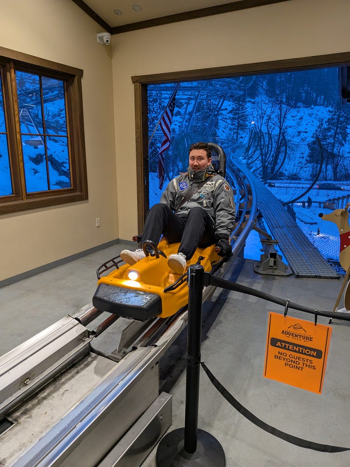 Full throttle and no brakes was the motto B3 and I took on both rides, and while we both excitedly zipped down the hill each time, there were a few points along the way where we both questioned whether it was a good call, as the cart was whipped around on the track as it plunged down the hill at some very high speeds. The cart’s braking components physically surround rails in the track, making it next to impossible for a cart to fly off. That tickling feeling rising from our stomachs into our throats was mostly driven by the exhilaration, not fear, and as you can see both from the picture I snapped of B3 at the end, and the one the ride took of me about halfway down, we were all smiles the entire way. I would definitely do that ride again. At $20 a ride that lasts about 5-7 minutes it’s on the high end, but it’s such a unique experience that it’s worth at least one visit in your lifetime.