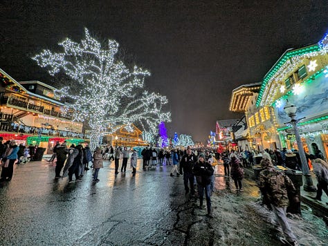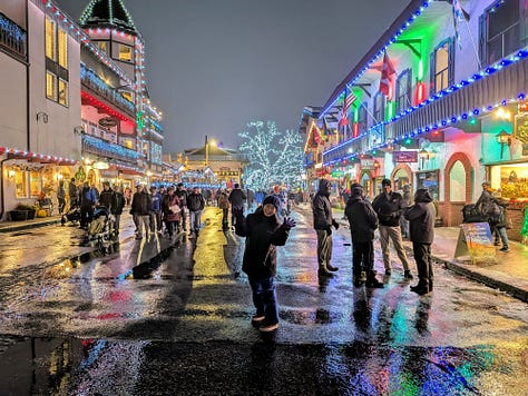 By 5pm we were ramped up, energized and hungry. As we wrapped up the coaster ride, we walked the 1/2 mile or so down main street to the Platz where all the shops and restaurants (and hundreds of pedestrians) were. We had dinner reservations at Visconti’s, a great Italian restaurant right in the middle of everything, but we still had some time to kill before then and we wanted to see the sites and lights as we strolled around downtown (If you want to see what is happening right now in downtown Leavenworth, here are some live cameras).