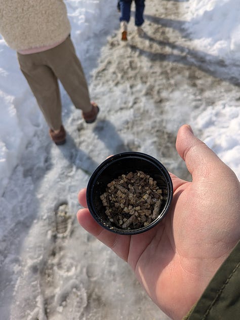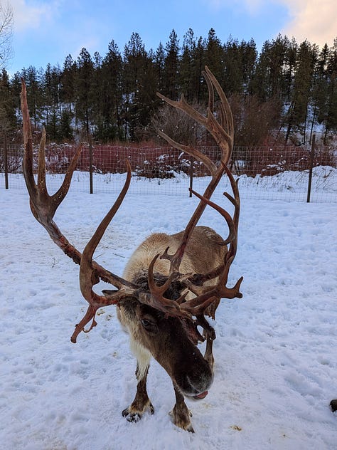 Once our tour started, they led us a couple hundred yards over to the opposite side of the property for a safety briefing, then they handed out cups of feed and let us into the large pen (about 100x100 feet) to get up close with the reindeer.
