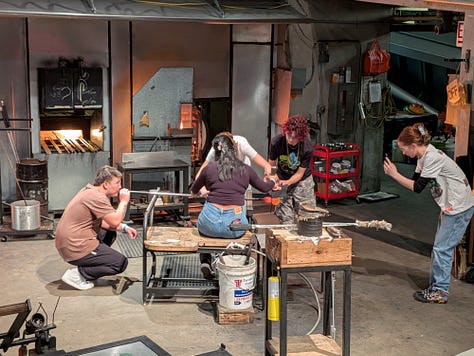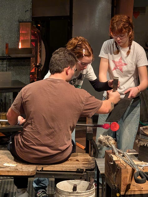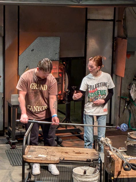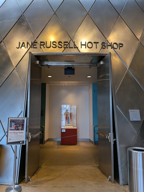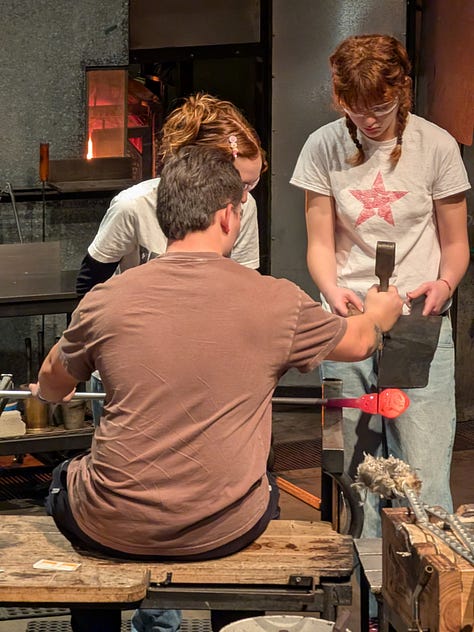 Kay and I sat in the viewing area watching them do their thing both in person and on the large screen tv with close up camera views of everything that was going on in the room. The museum has excellent outreach programs and the two girls working with B3 and Tatiana were local area high school Juniors that were already well-versed in their craft. It was very impressive to watch them both technically and socially interact while explaining how to blow the glass without just doing it themselves and giving the customer the opportunity to engage directly with the process.