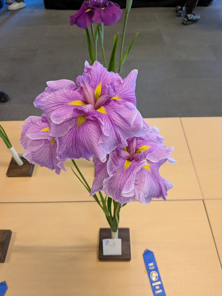 Visitors were invited to cast their vote for their favorite flower and display with a First-Place ribbon. My personal favorites were two stunning irises, both with a predominantly white background and delicate streaks of purplish lines radiating from the center.
