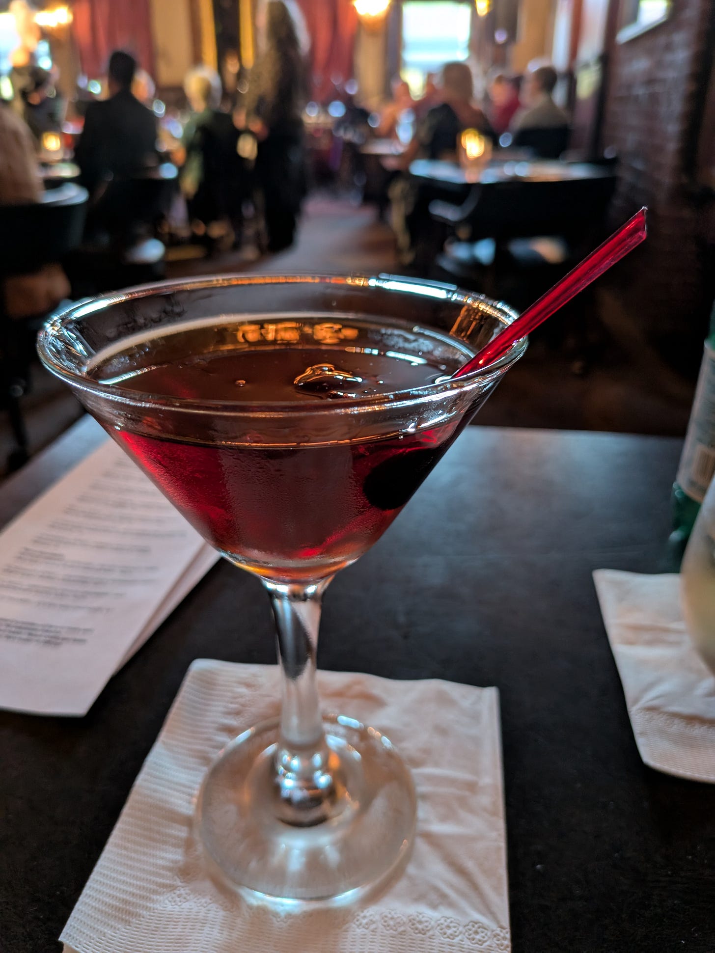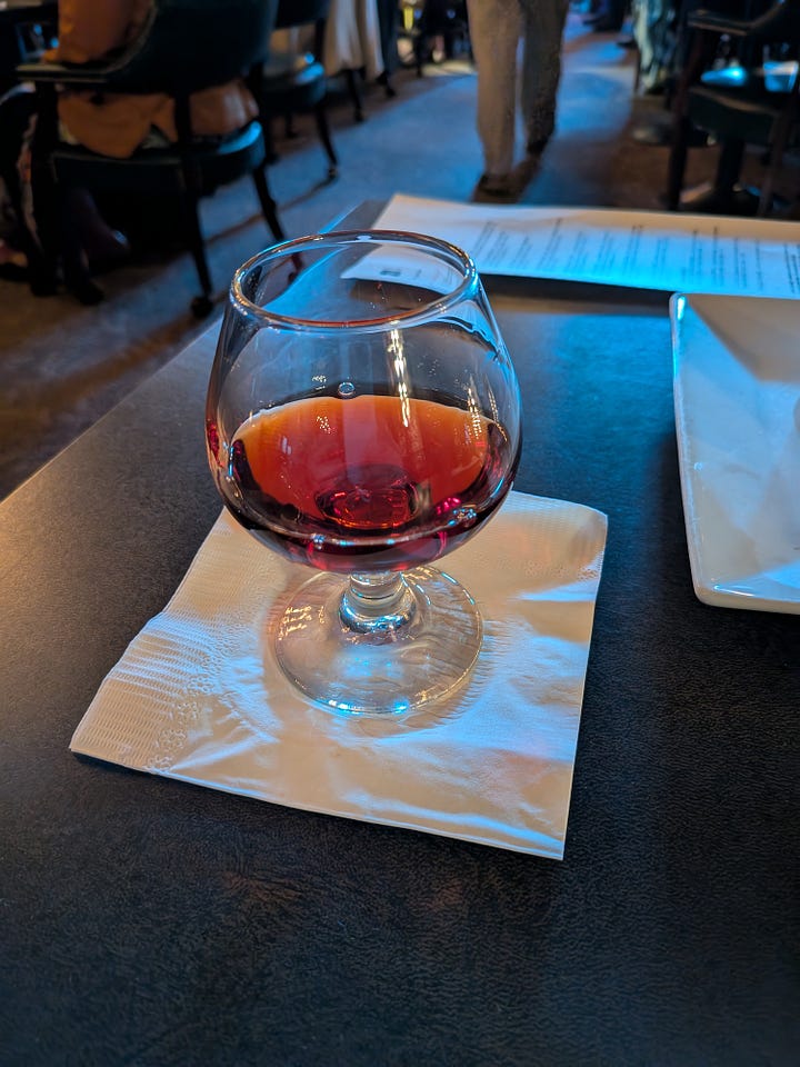 I had a 6pm dinner reservation and the show was at 7. I arrived around 515 and was immediately seated. The space was fairly dark and dated, but charming. I ordered one of their Dark Manhattans and found it to have the perfect sweetness mixed with bitters and bite from the Knob Creek Rye. Looking around at the clientele I was reminded of the entertainment room of a convalescent home, but I perused the menu and plowed on anyway.