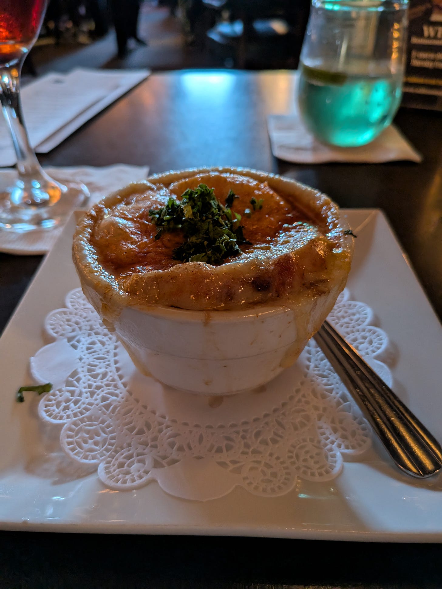 They have a pre-fixe three course meal with three options for each course. I chose a cup of French Onion soup to start. The soup was laden with umami and the cheese was stringy and playful. I loved it.