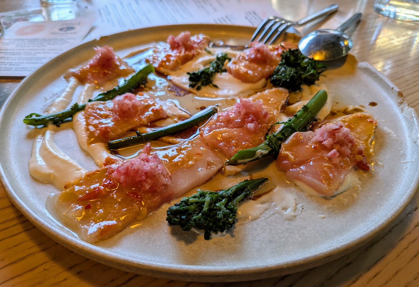 Completing this fantastic trio of initial bites was the Hamachi Crudo. Described perfectly as an "opening act," this dish was a vibrant and refreshing experience. The delicate, buttery slices of Hamachi were beautifully complemented by the subtle smokiness of the buttermilk, while tender sprouting broccolini offered a touch of welcome bitterness. Pickled rhubarb provided a sweet and tart counterpoint; all tied together by the nutty richness of brown butter and a gentle kick from Calabrian chilis. It was a masterful balance of flavors and textures.
