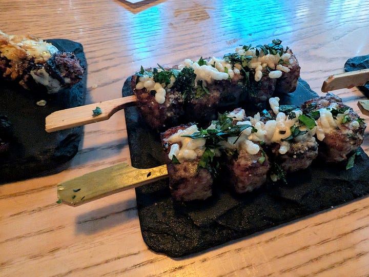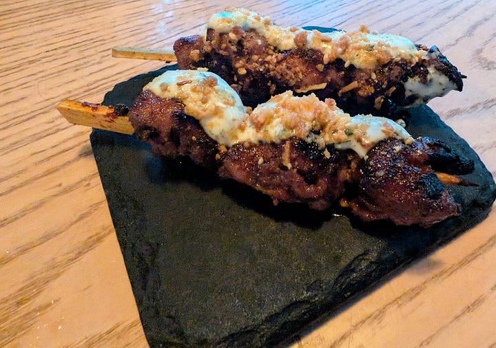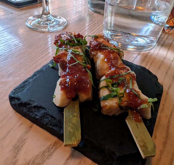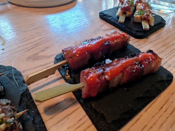 Hot on the heels of these remarkable starters came a playful series of skewers. The only one gracing the regular menu was the Pork Belly with maple and fresno sriracha. The combination of sweet, savory maple with the smoky heat of the fresno sriracha glazed the perfectly rendered pork belly, creating an irresistible bite. The off-menu offerings continued this trend of culinary creativity, featuring succulent pieces of beef, each boasting its own distinct and delicious sauce, and tender chicken skewers with equally intriguing flavor profiles. These impromptu creations were a testament to the chef's versatility and added an element of delightful surprise to the meal.