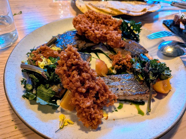 As the main event, the chef presented us with two distinctly different yet equally impressive plates. First was the Crispy Blackened Trout. The skin was indeed wonderfully crisp, offering a satisfying crackle with each bite, giving way to tender, flaky flesh within. The smoked buttermilk sauce provided a creamy, tangy counterpoint to the earthy blackening spices, while fresh dill added a bright, herbaceous note. The inclusion of turmeric pickles was a nice touch, offering a tangy and slightly sweet counterpoint. Adding a bit of welcome bitterness was the spring Raab, and the artistic potato coral provided a delicate, crispy texture that was as visually appealing as it was delicious. This dish was a harmonious blend of flavors and textures, showcasing a thoughtful approach to a classic ingredient.