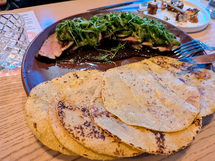 Our second entree was another delightful surprise, an off-the-menu Beef Tenderloin that felt both rustic and refined. The highlight here was undoubtedly the incredibly soft and flavorful beef with its marbled richness over a smooth and smokey mole sauce and topped with greens. This was served alongside handmade tortillas, still warm and pliable, perfect for building our own little tacos. The chef had clearly put care into every element, from the quality of the beef to the simple yet satisfying accompaniment of the fresh tortillas, making this a comforting and memorable dish.
