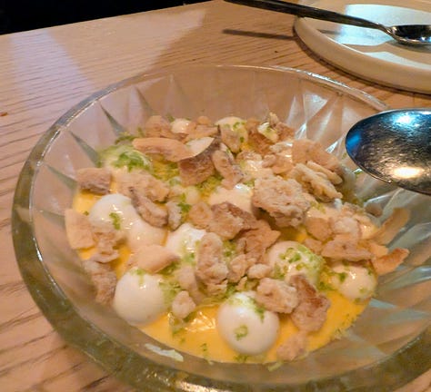 Next up were the Fingerling Potatoes – so utterly addictive that they vanished before I even thought to snap a photo, hence their absence here (We promptly remedied this by ordering a second round, which I also forgot to photograph!). These weren't your average potatoes; they were perfectly cooked, boasting a satisfyingly crisp exterior and a fluffy interior, all enhanced by a cooling creme fraiche dip, fragrant basil oil, and bursts of briny, citrusy trout roe. Trust me, these are a must-order.