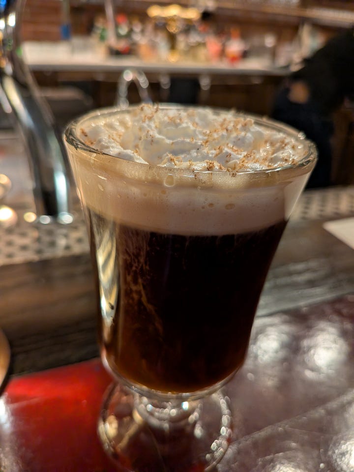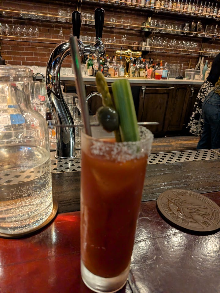 I started out with an Irish Coffee with Irish Whiskey, coffee, demerara and cream made by the house bartender. Then, when the food showed up, I switched to a Bloody Mary to balance the savoriness of the drink with the sweetness of the meal.