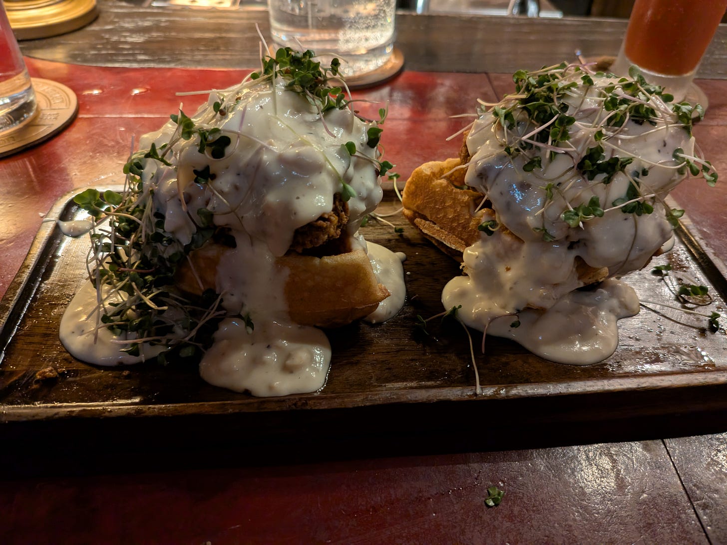 I dug in right away and let me tell you that this entree hit all the right notes for me. If I had any complaint at all, I would say that it was maybe a slight bit too sweet with the vanilla in the waffle batter. I probably would have left that out and doubled down on the savory aspect with a little chipotle hot sauce and/or a lot more black pepper in the country gravy.