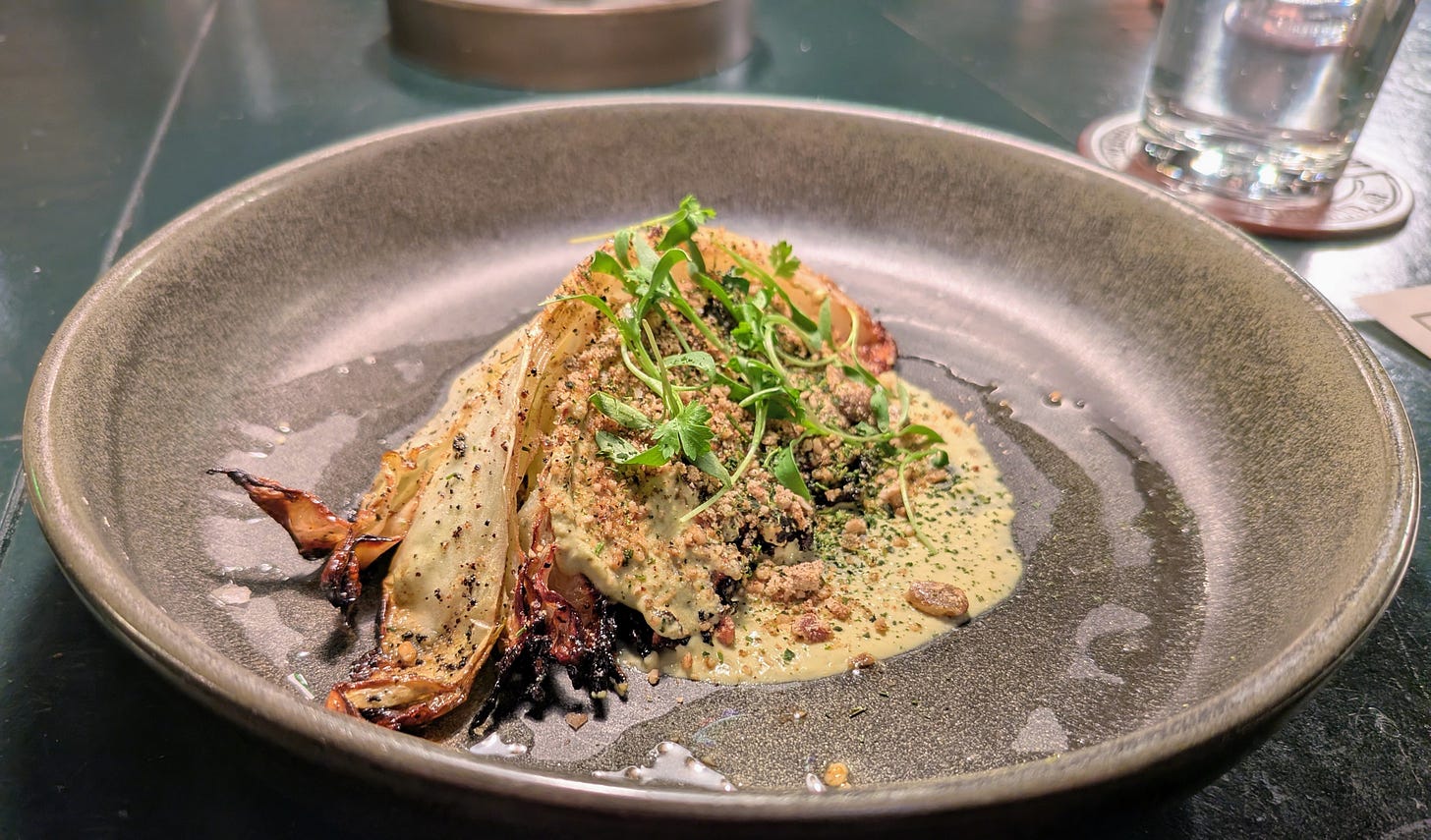 For this course the house waiters started us out with a cocktail made with Knob Creek Bourbon, Sante Fe Mesquite Single Malt, Carpano Blanco, Rothman & Winter Apricot and Oloroso sherry. This smokey and slightly sweet concoction was perfectly paired with Charred Cabbage: a fire-roasted wedge of cabbage, creamy mole verde, pickled Serrano, toasted pepita crumble and cilantro ash.