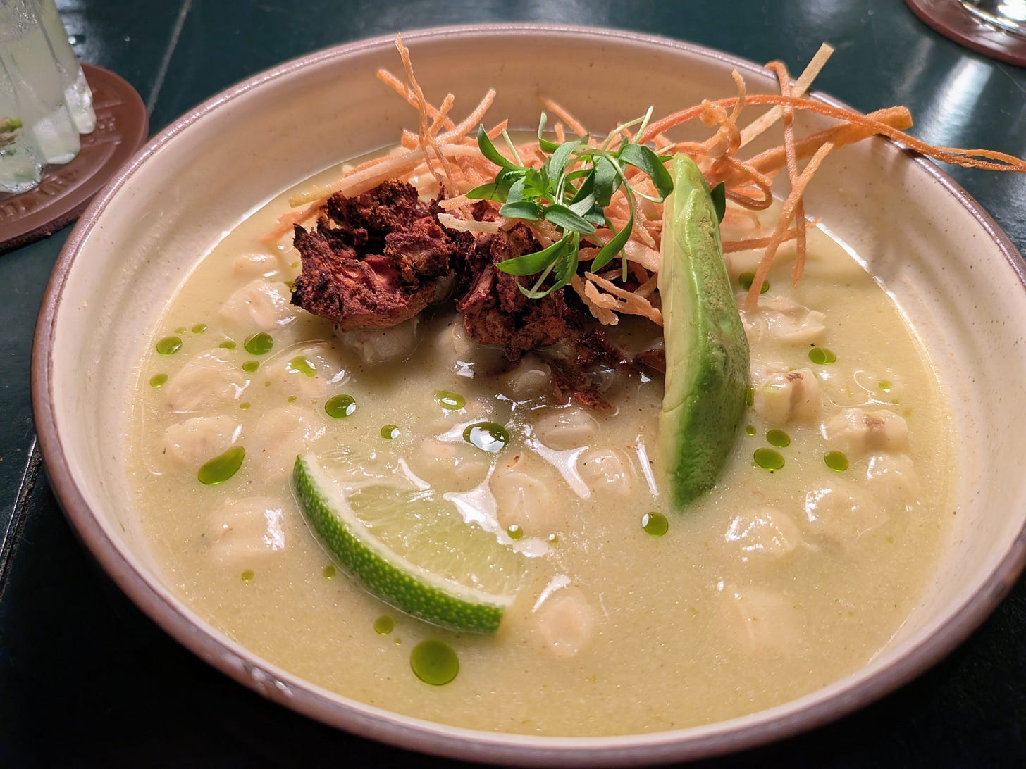 To go with the sublime cocktail they presented us each with a bowl of Pozole Verde, which included heirloom hominy in a roasted tomatillo-poblano broth, confit chili-roasted jackfruit, avocado, pepita crumble, micro cilantro and Chile oil.