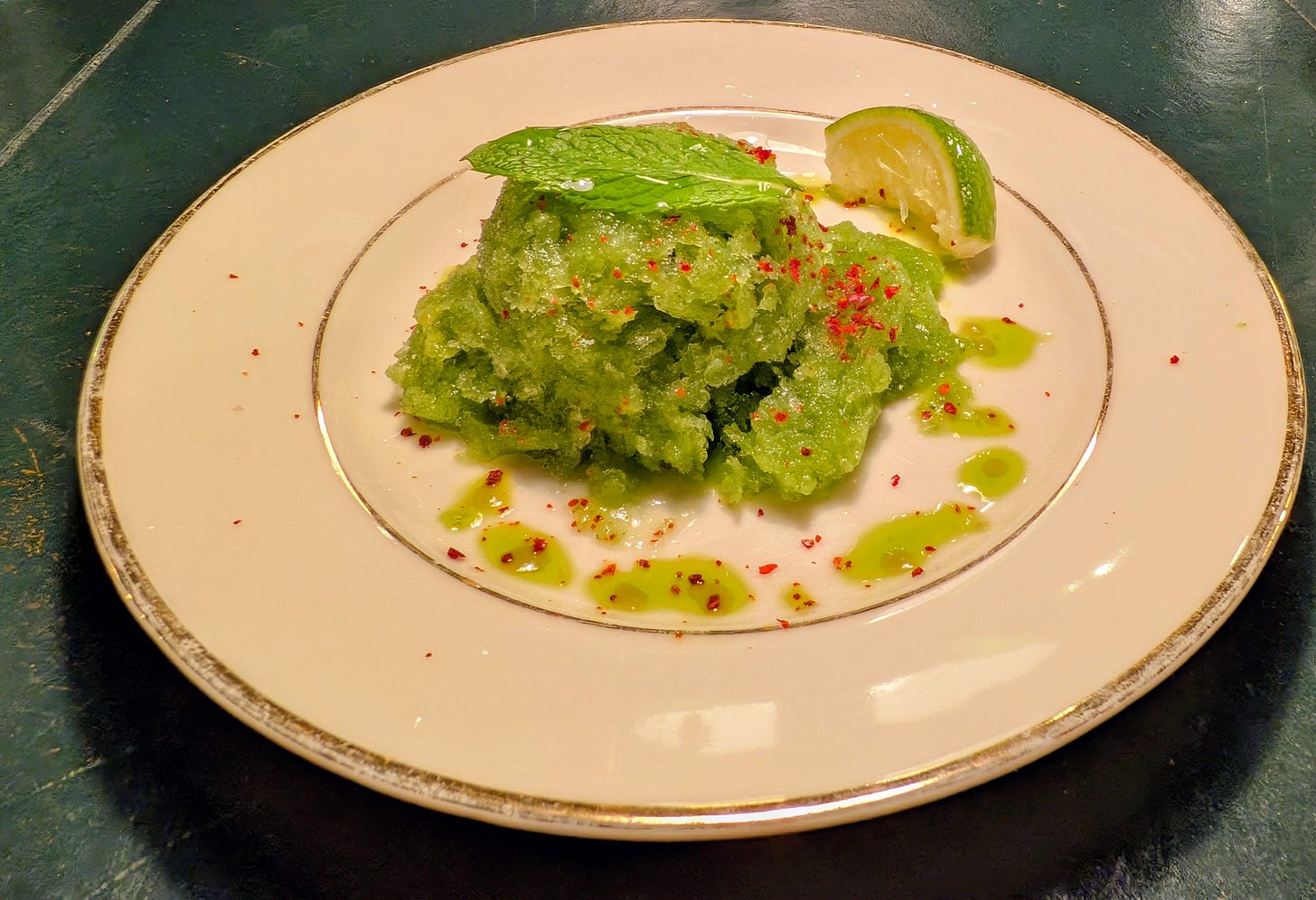 The chef and his team mingled a few more minutes then excused themselves as they proceeded back to the kitchen to finish out the last two dishes. First up was a palate cleanser, a Cucumber Lime Granita made from shaved ice with fresh mint and allepo chili salt. This was spectacular and definitely achieved it's goal of completely resetting the palate of the previous spicy dishes to prepare diners for consuming the final course, dessert.