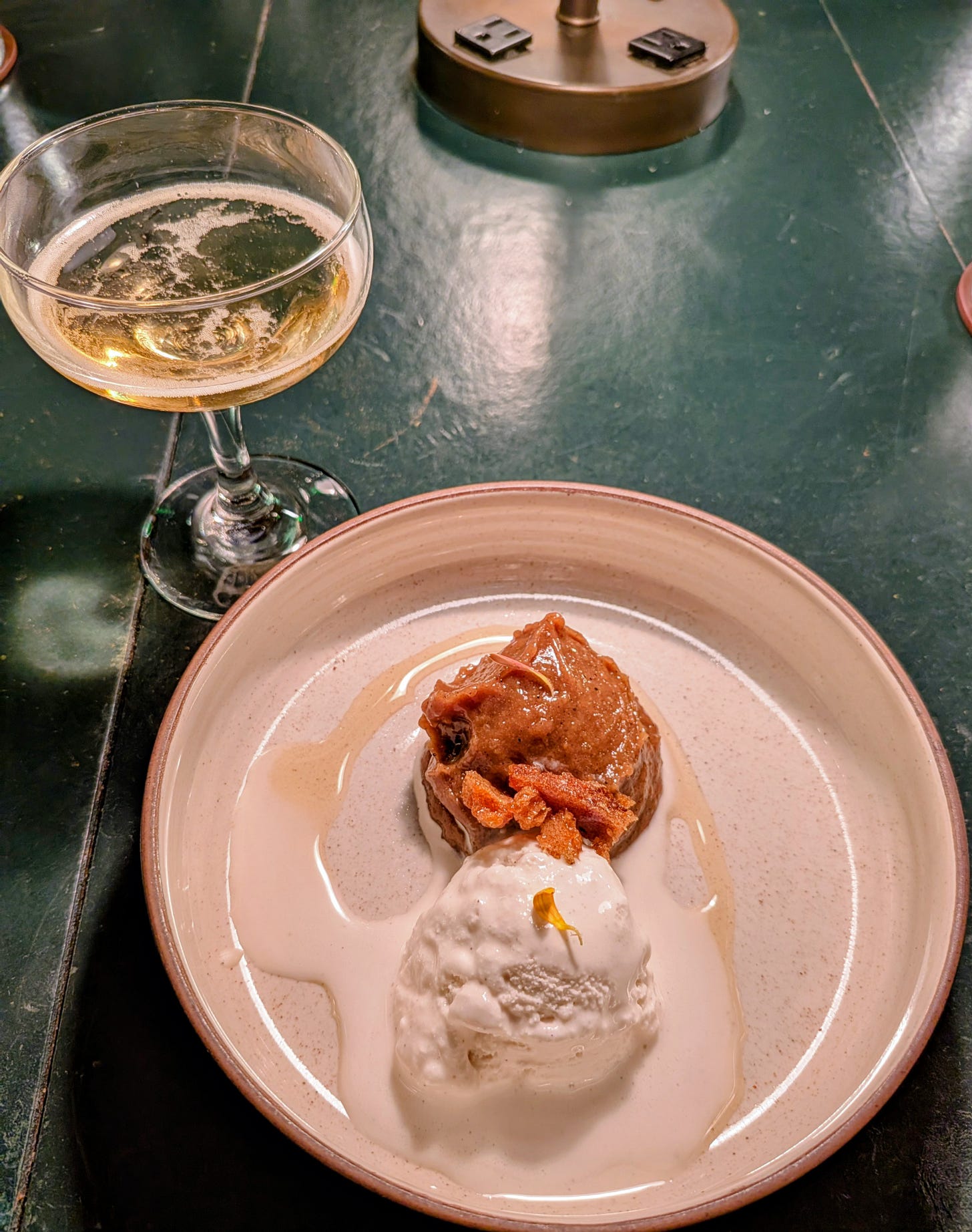 To get us ready for the final dish our waiters brought each of us a coupe of Muri Passing Clouds Non-alcoholic Sparkling Wine. Remember earlier when I said that the vegan aspect extended to the cocktails? Well this N/A sparkling wine tasted strongly of honey but that would have made it non-vegan. It turns out that through the use of quince they are able to achieve that honey-like flavor. After marveling over that it took me a moment to go back and remember that this wasn't even alcoholic. I strongly recommend any readers that aren't alcohol drinkers to investigate this very special N/A sparkling wine as you will not be disappointed.