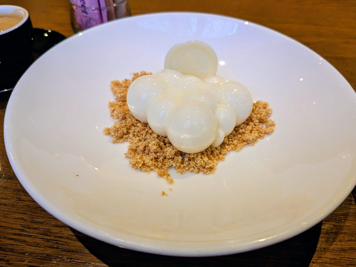 For dessert I went with the Passion Fruit Cremoux. The presentation was striking, smooth white cream cheese-based mouse set in a cloud mold and positioned over a bed of graham cracker crumble. It was light and bright after such a rich main course, but the real surprise came halfway through when I hit a hidden layer of passion fruit gelée tucked inside. That unexpected burst of tartness elevated the whole dessert. Paired with an espresso, it was the perfect ending to dinner and the beginning of the energy I would need for part two of the evening.