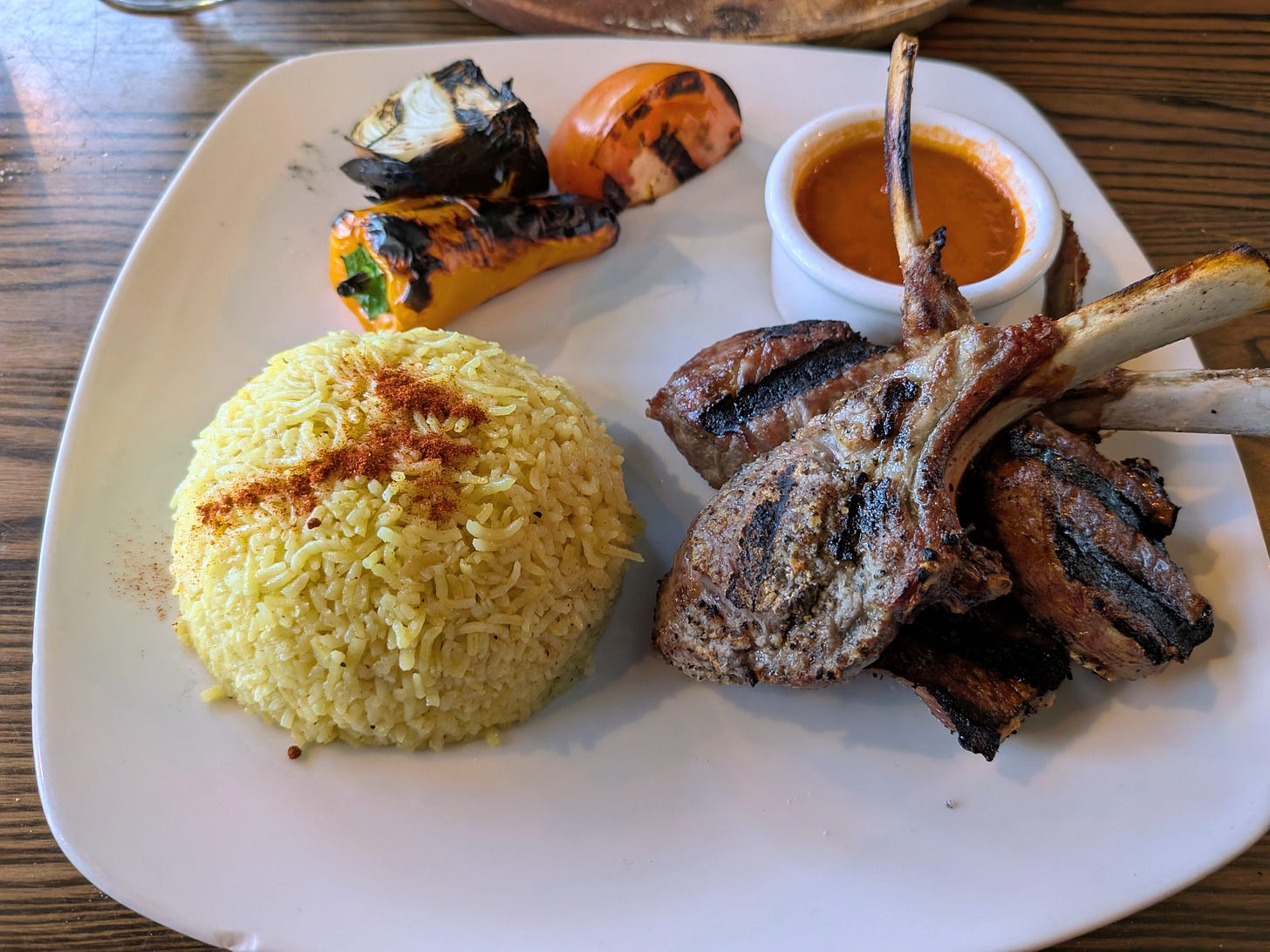 They are, without exaggeration, the best lamb chops I have ever had. Perfectly seasoned, grilled just right, and served with grilled tomatoes, onions, green pepper, homemade tomato sauce, and basmati saffron rice.