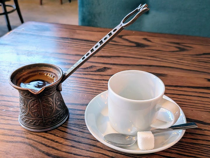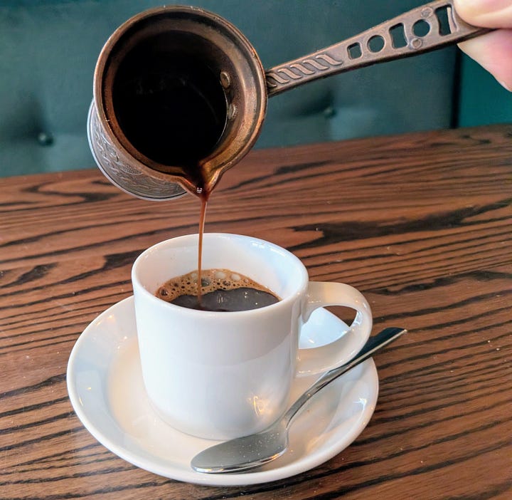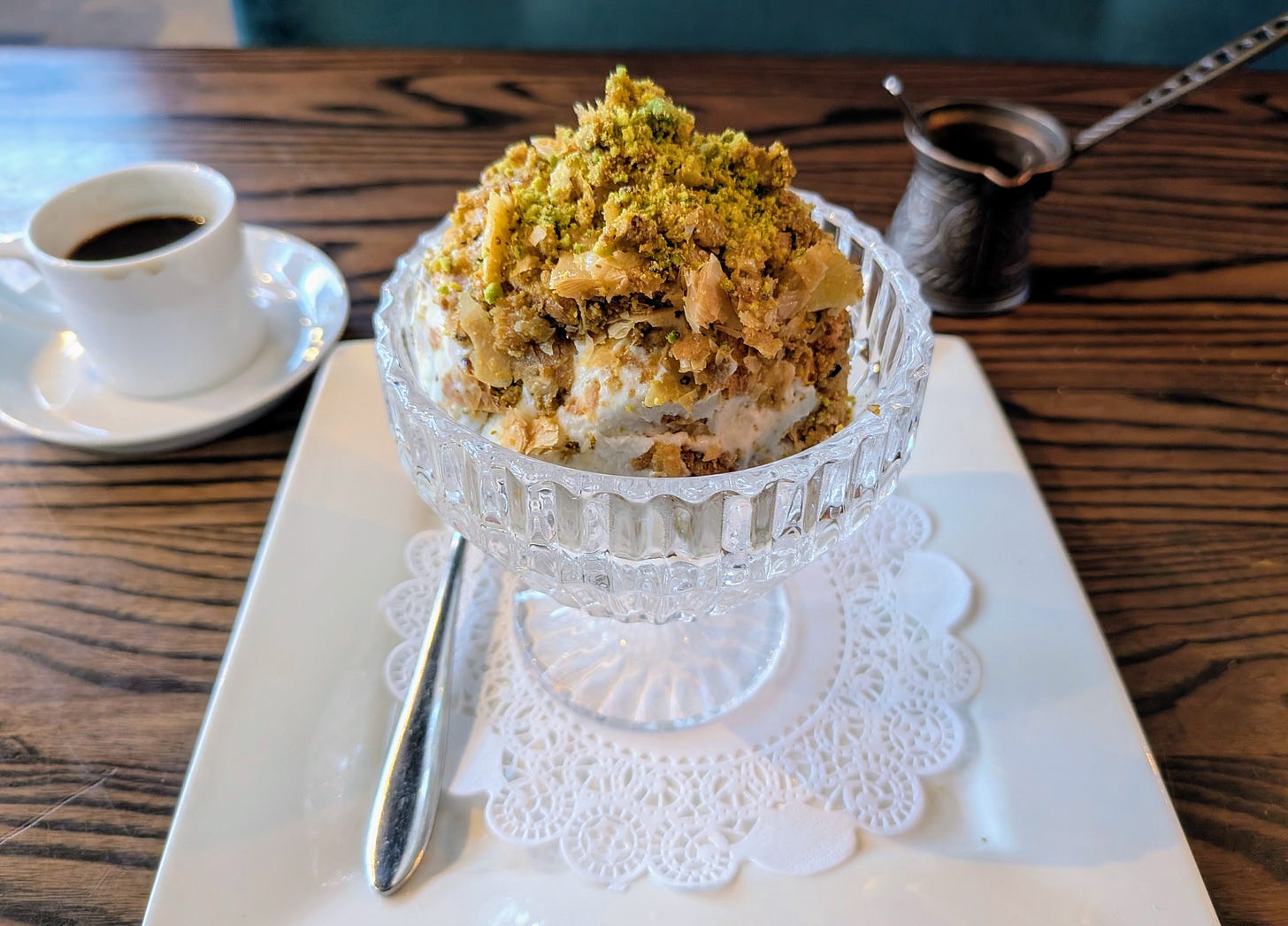 I paired this with a thick Lebanese coffee flavored with cardamom, self-served from a long-handled rakweh. Strong, aromatic, and just enough bitterness to balance the sweetness of the dessert.