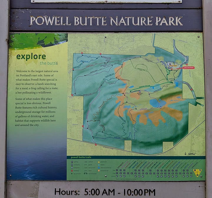 My quest began in the far southeastern corner of Portland at the Powell Butte Natural Area. A 30-minute drive out Powell Blvd leads to this expansive 611-acre nature park, a mix of meadowland and forest first purchased by the city in 1925. After a quick drive up the hill, a large parking lot offers space for 60-80 cars.