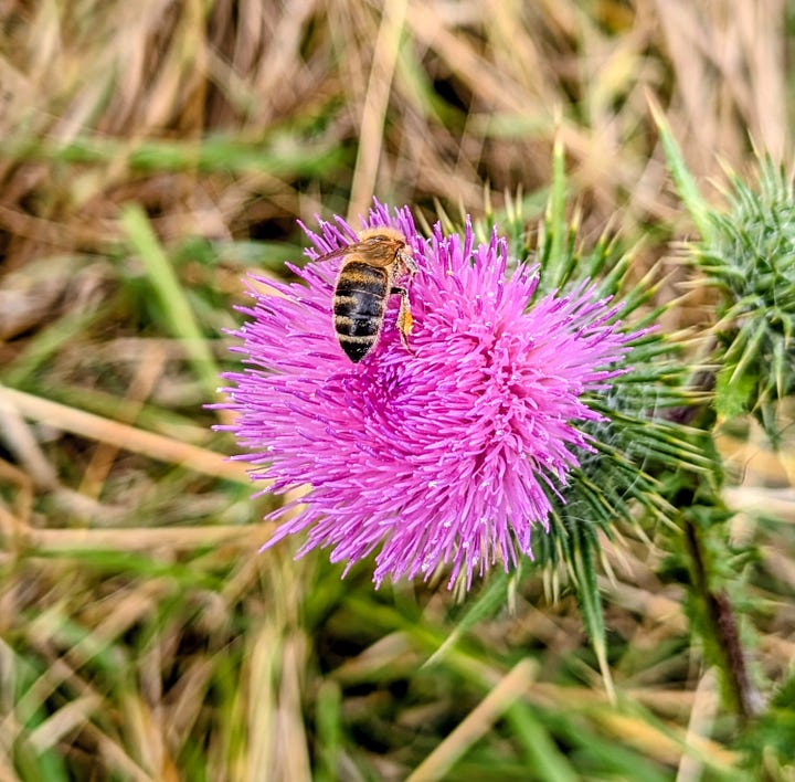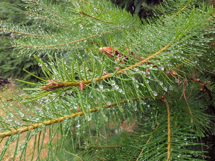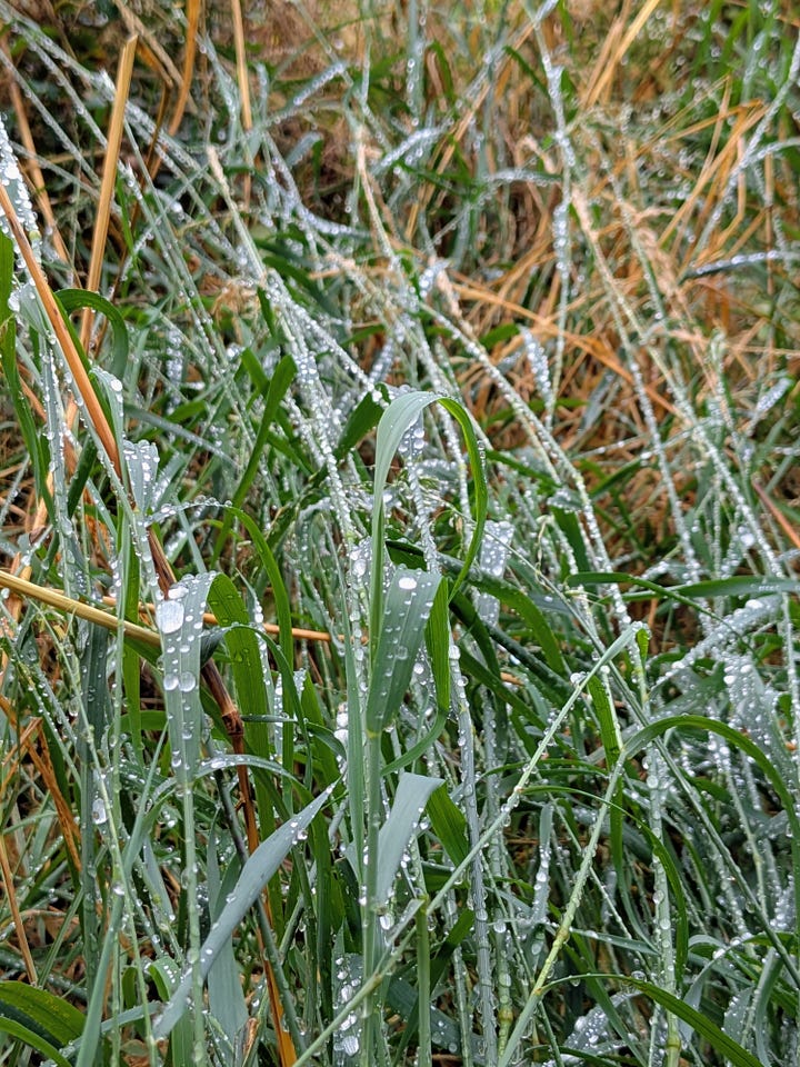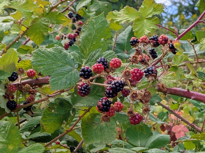 A recent rain shower had just passed through, leaving a million tiny jewels on the blades of grass and pine needles as the sun began to break through the clouds. The blackberries along the trail were plump and plentiful, and wildflowers added splashes of color to the scenery.