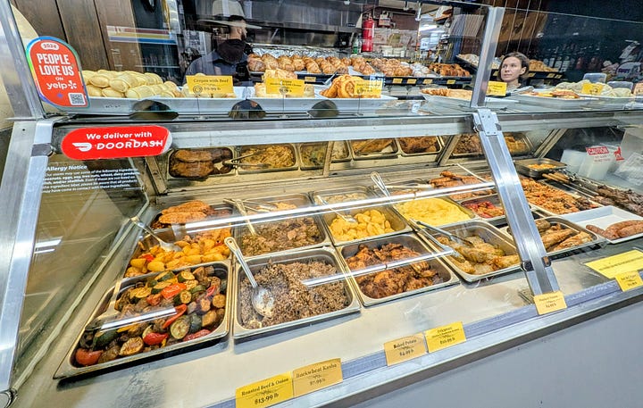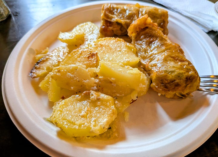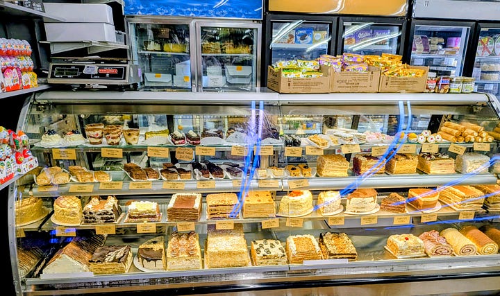 Sensing my delighted bewilderment, a kind woman from behind the deli counter asked if I needed help. I told her I was looking for lunch, and she led me to the hot food counter. I chose two rolls of Golubtsi (cabbage stuffed with ground beef and rice) and a side of potatoes. There was no way I was leaving without dessert, so I also selected a slice of rich, dark chocolate layered cake.