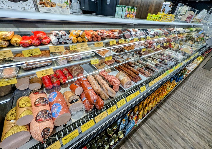 The moment I pushed through the front door, with its Cyrillic signage, I was transported. The air was filled with the scent of baked bread and savory meats, and the lively chatter was entirely in Russian. I meandered through the aisles of the bakery, deli, and fresh food sections, amazed by the selection.
