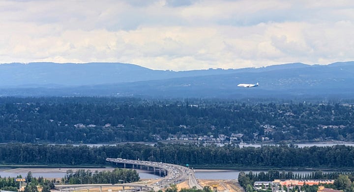 A large, graveled path leads from the parking area to the crown, where a stunning 360-degree panorama unfurls. The view encompasses the entire city, the Columbia River Gorge, and a front-row seat for watching airplanes on their final approach to PDX.
