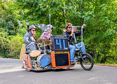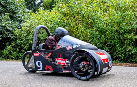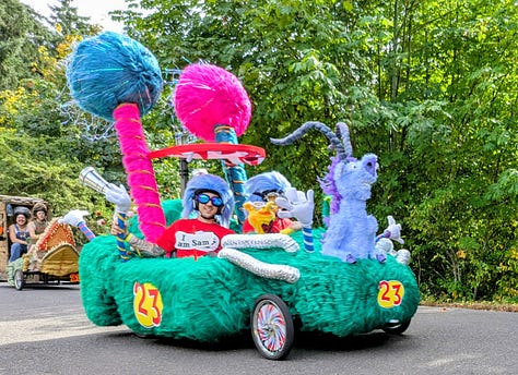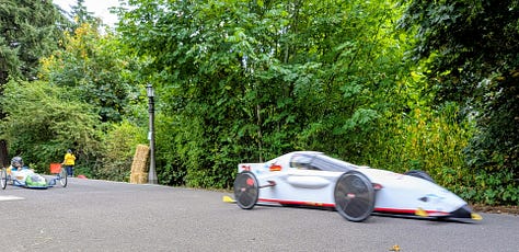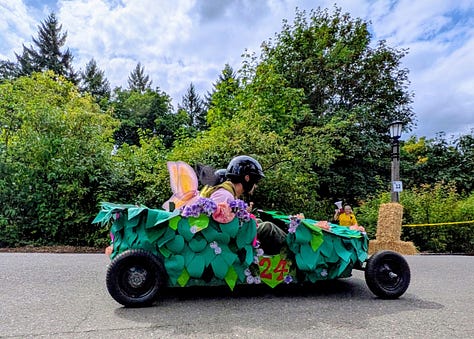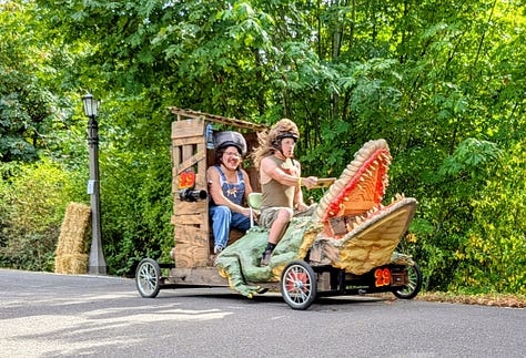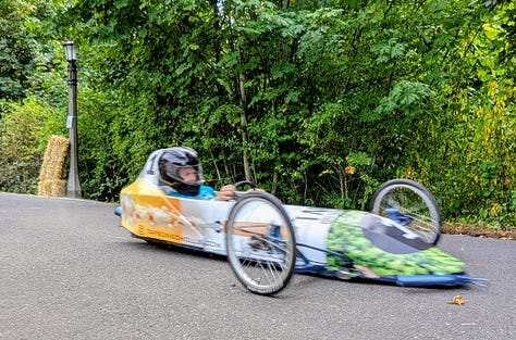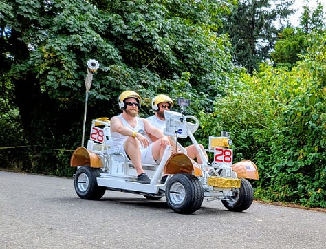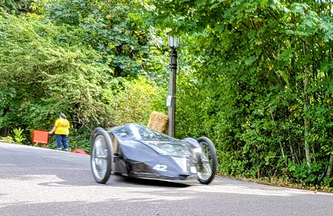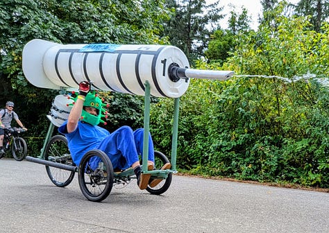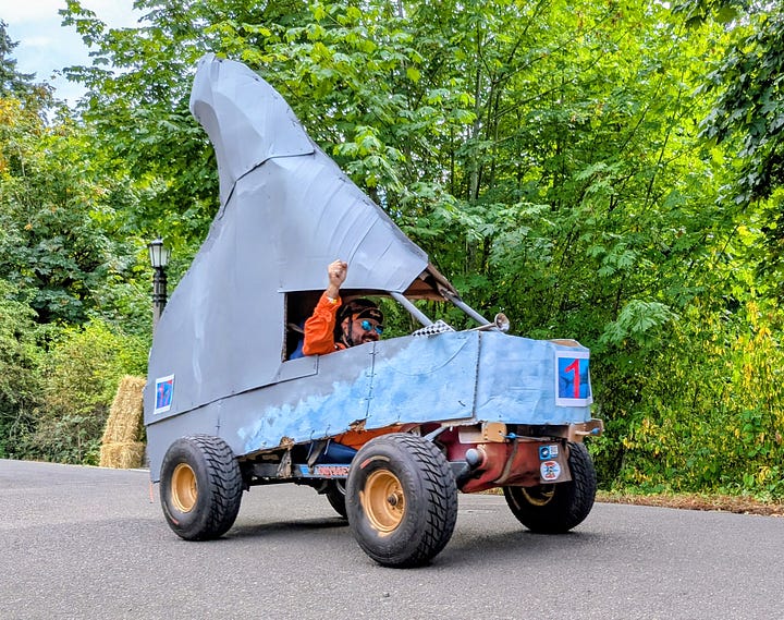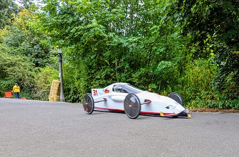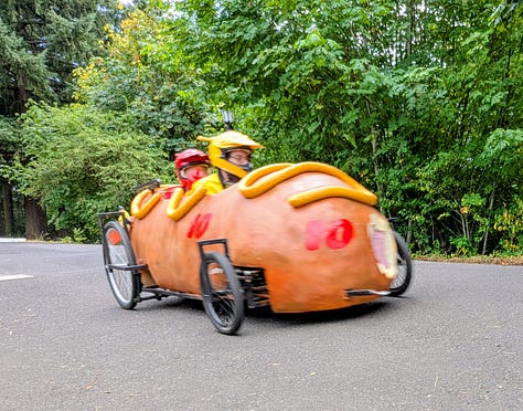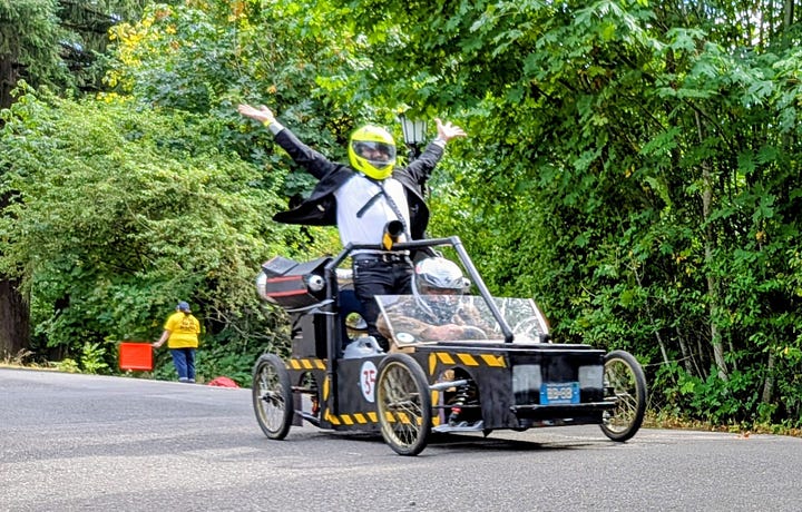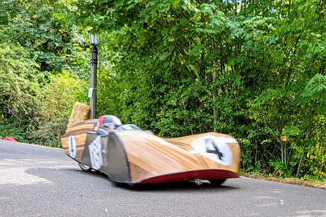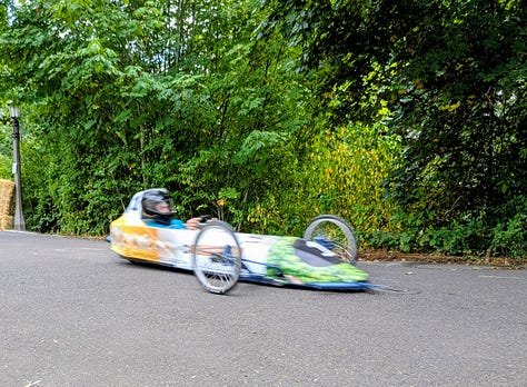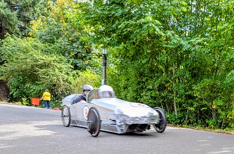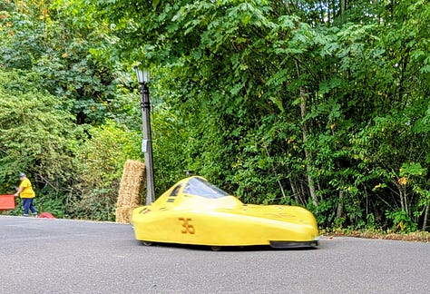 The top three racers were all heavy, streamlined vehicles whizzing by at speeds I’d estimate between 30 and 40 miles per hour. The late afternoon sun broke through the clouds, bathing the scene in a perfect 75-degree glow—a quintessential Portland afternoon dedicated to its celebrated weirdness.