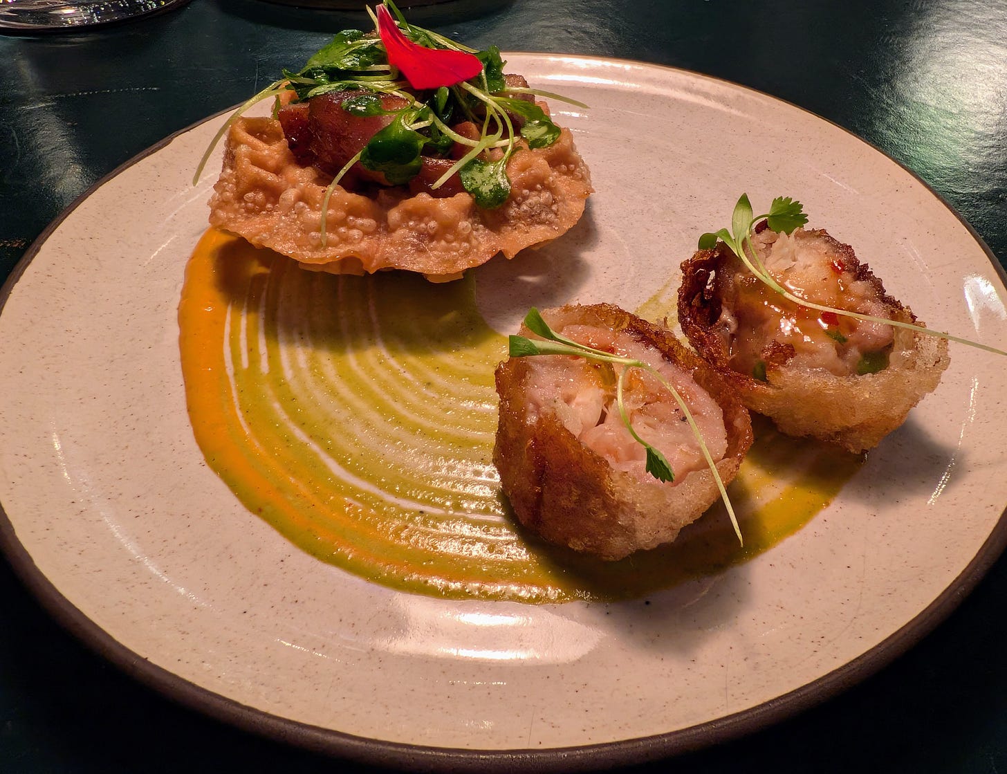This dish featured sashimi-grade Hamachi swimming in a Thai-style chili-lime fish sauce and watermelon-lime granita and entwined with slivers of crisp cucumber. The granita's acidity cut through the smokiness of the mezcal cocktail perfectly. The standout surprise, however, was the chewy, flavorful fried garlic that adorned each piece of fish, adding a delightful textural pop.