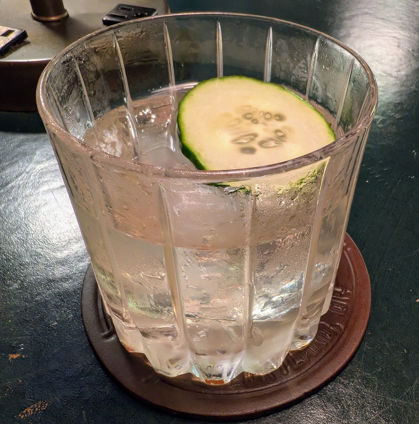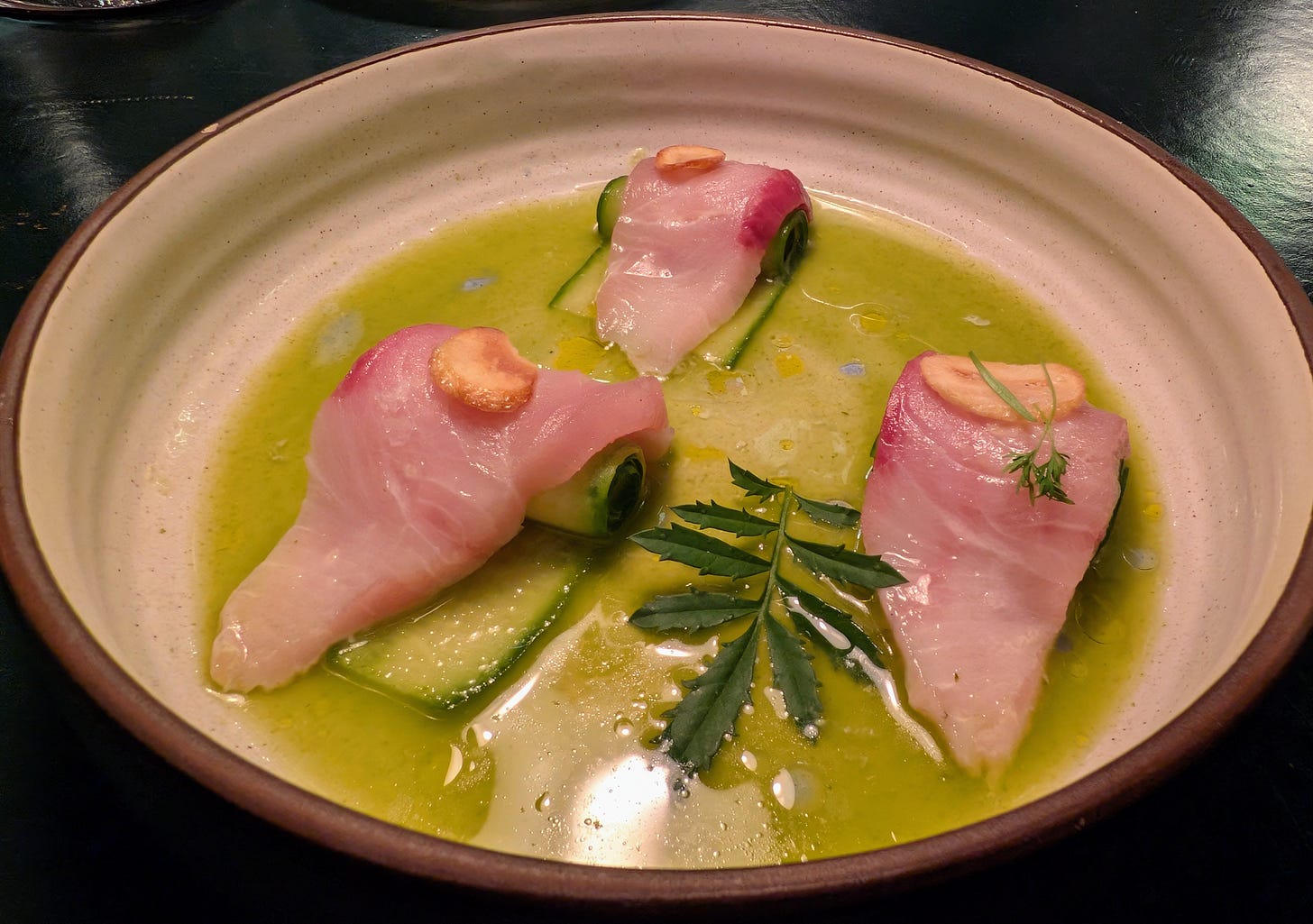 Our next cocktail was the star of the show: a smoky and sweet blend of Mezcal Union, Noilly Prat Dry Vermouth, Huana Guanabana, and cucumber. This drink was a masterpiece, but a limited one—I tragically spilled most of mine and it couldn't be replaced. Thankfully, what I did taste was a flawless match for the next dish: a Hamachi Aguachile.