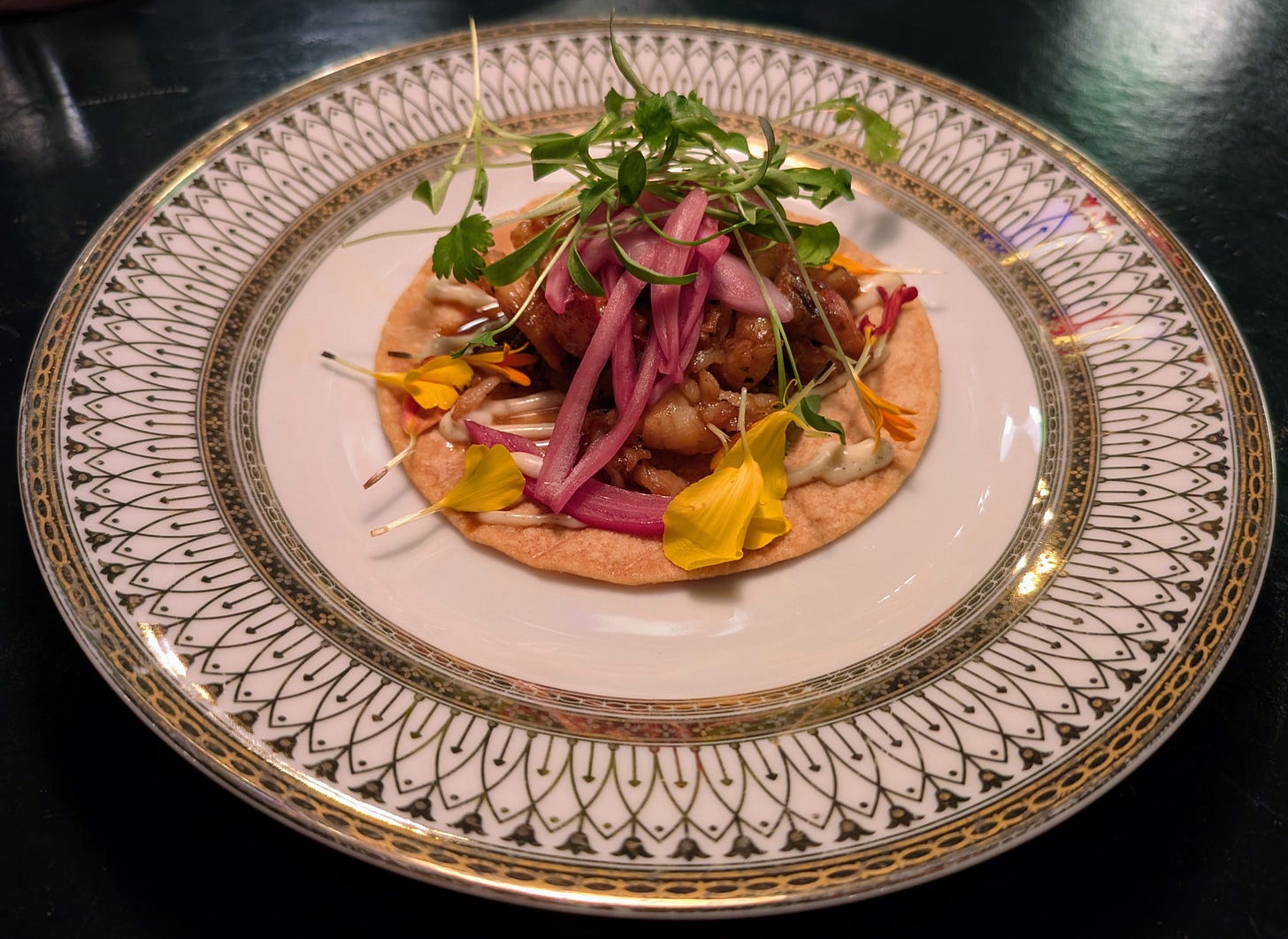 The energy at the table was buzzing as we moved on to the third pairing. A glass of 2022 Francois et Julien Pinon Vouvray Les Deronnieres was served alongside a Black Pepper Lobster Taco. The taco was a beautiful creation: tender lobster tossed in oyster sauce and black pepper, served on a crispy tostada shell with pickled purple onions (cebolla curtida) and a Thai chili sauce. While the wine was a passable pairing, I felt it was a missed opportunity to truly elevate what was, by far, the pinnacle of the meal. The lobster was succulent, and the combination of spices and textures was simply stunning.