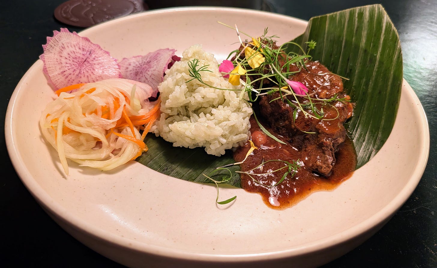 Any disappointment, however, evaporated the moment the Beef Cheek Birria Hung Lay arrived. A slow-braised chunk of beef cheek that fell apart with just the touch of a fork. It was served with roasted peanuts, pandan-infused rice, pickled beets, papaya, and a rich hung lay curry spiced sauce. The flavor was so incredible that I wanted to lick the plate clean. Each slow, savoring bite was a highlight of the night.