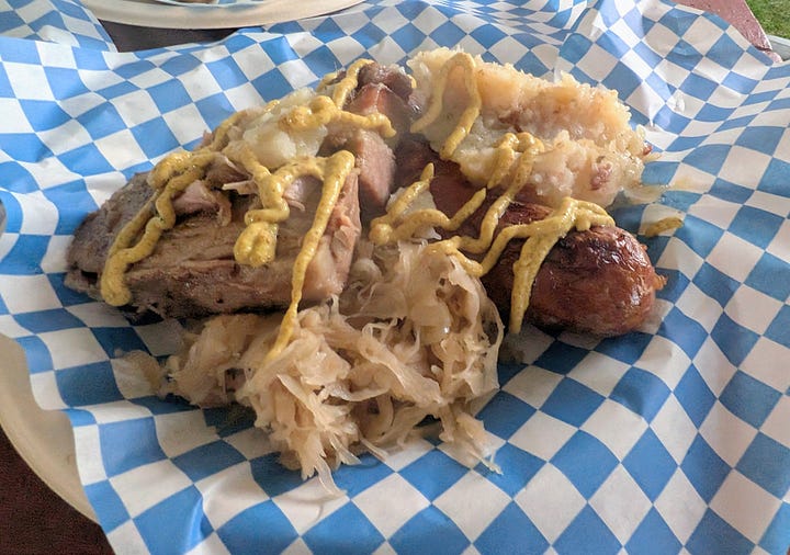 Outside, multiple food tents served German and Bavarian specialties. Unfortunately, the food line was long, and the pickup line was another wait. But once I finally had my tray and found a seat I dug in.