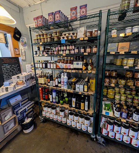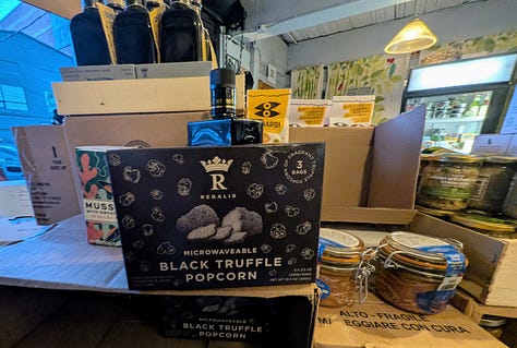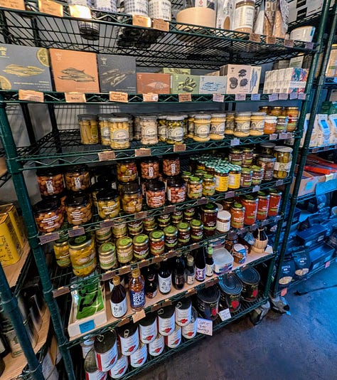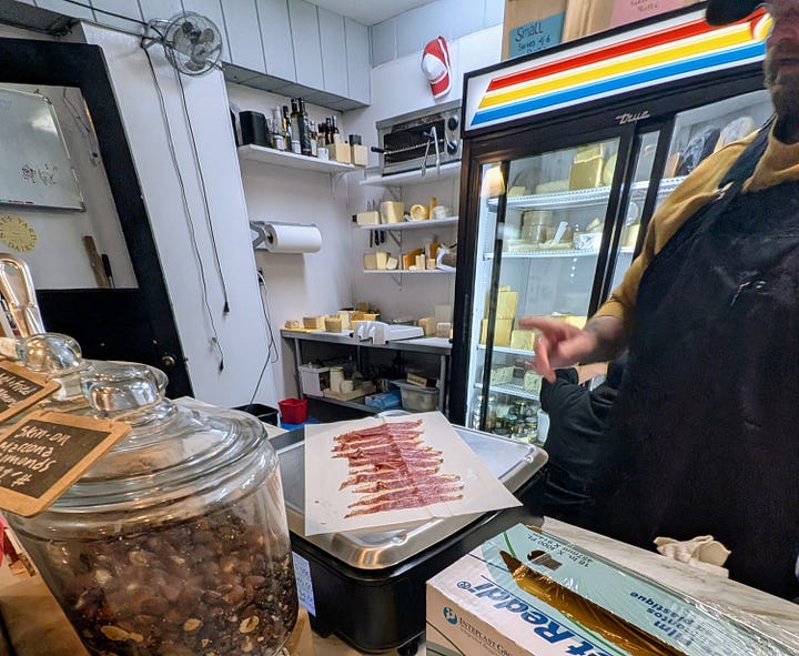 The shop is maybe 20×20 feet, but packed with great finds like pickles, sauces, black truffle popcorn (I bought a box), and more. A couple from Vancouver was ahead of me ordering what felt like half the shop’s meat case (but I don’t fault them one bit and I ended up mimicking much of their order on a smaller scale) so I had time to enjoy some samples while the butcher sliced up their order for ten minutes straight.