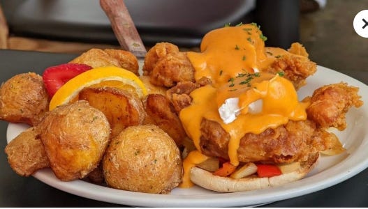 While we were right next to each other, because we sat at separate tables, I didn’t have an opportunity to get photos of what the kids ordered and had to use photos from the restaurant’s website. They had the Chick Pops (Crispy fried chicken and waffle bites with maple syrup. Served with spicy mayo) and the Crispy Chicken Benedict (Cherry tomato, red bell pepper, onion, spicy hollandaise sauce).